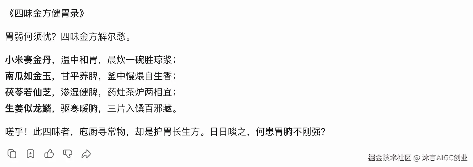 《4种黄金食材,让你的胃越来越强壮》 小米养胃王,早晚一碗胃不伤; 南瓜护胃宝,蒸煮炖汤消化好; 山药健胃方,软糯香甜胃不慌; 生姜暖胃强,驱寒助消化更强。 常吃这四样,胃好身体棒!