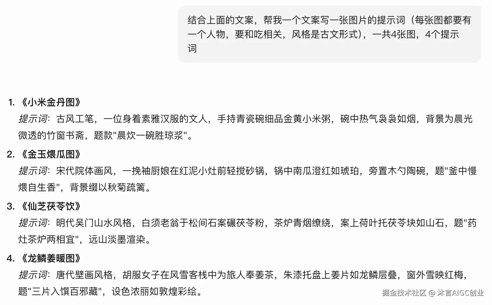 结合上面的文案,帮我一个文案写一张图片的提示词(每张图都要有一个人物,要和吃相关,风格是古文形式),一共4张图,4个提示词