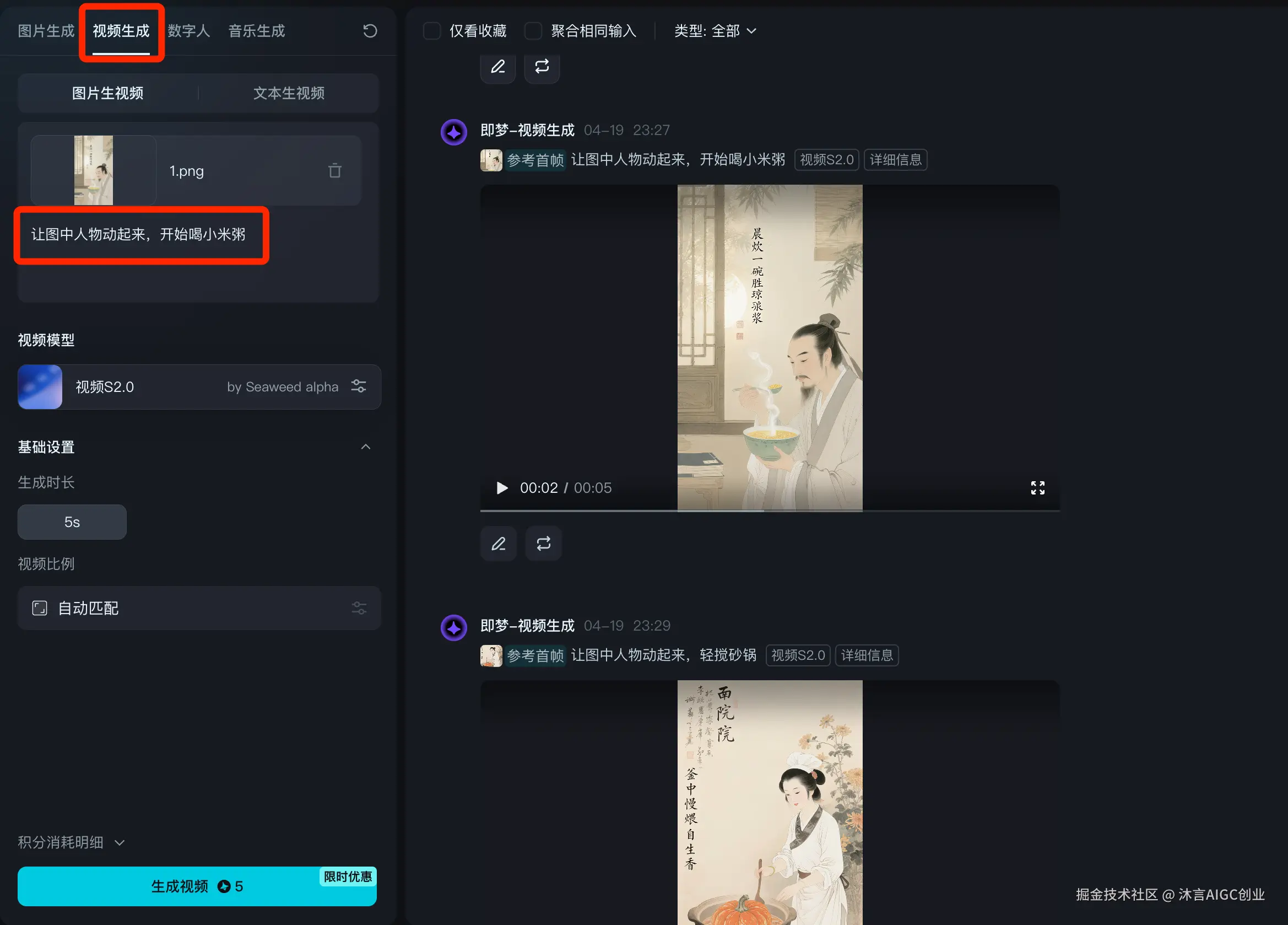 让图中人物动起来 + 一个具体动作,例如:让图中人物动起来,开始喝小米粥;让图中人物动起来,轻搅砂锅。 这种提示词难度不大,大家需要学着自己写一下。