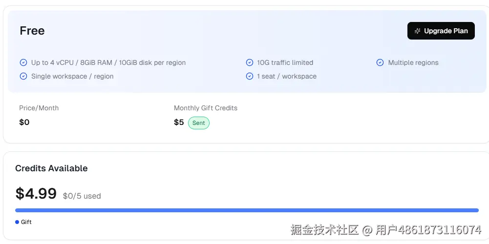 现在,只要你绑定一个注册超过180天的 GitHub 账号,每个月就能白拿 $5 配额,不用绑卡,直接用。可以用来部署应用,资源限制是:最多 4 核 CPU、8GB 内存、10GB 磁盘、10GB 流量。
