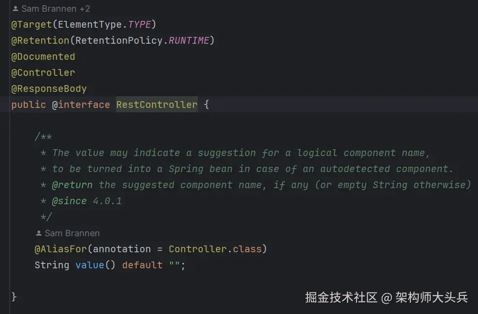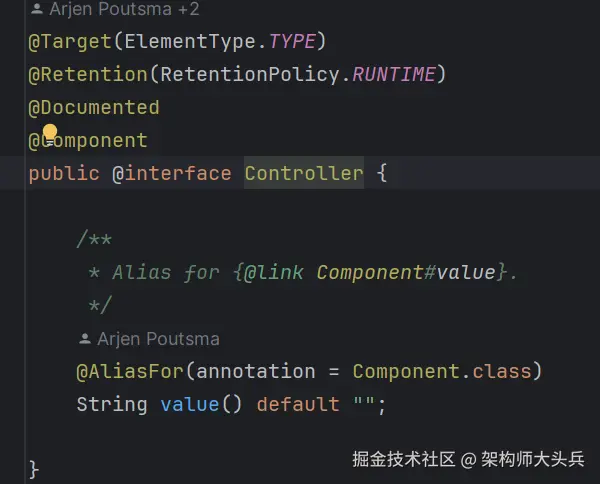 通过源码实现我们发现@RestController、@Controller 、@Service、@Repository都继承了父注解@Component,@Component 的作用是把普通pojo实例化到spring容器中,相当于配置文件中的,Spring会扫描加了@RestController、@Service、@Controller、@Repository、@Component注解的类,并把这些类纳入进spring容器中管理。