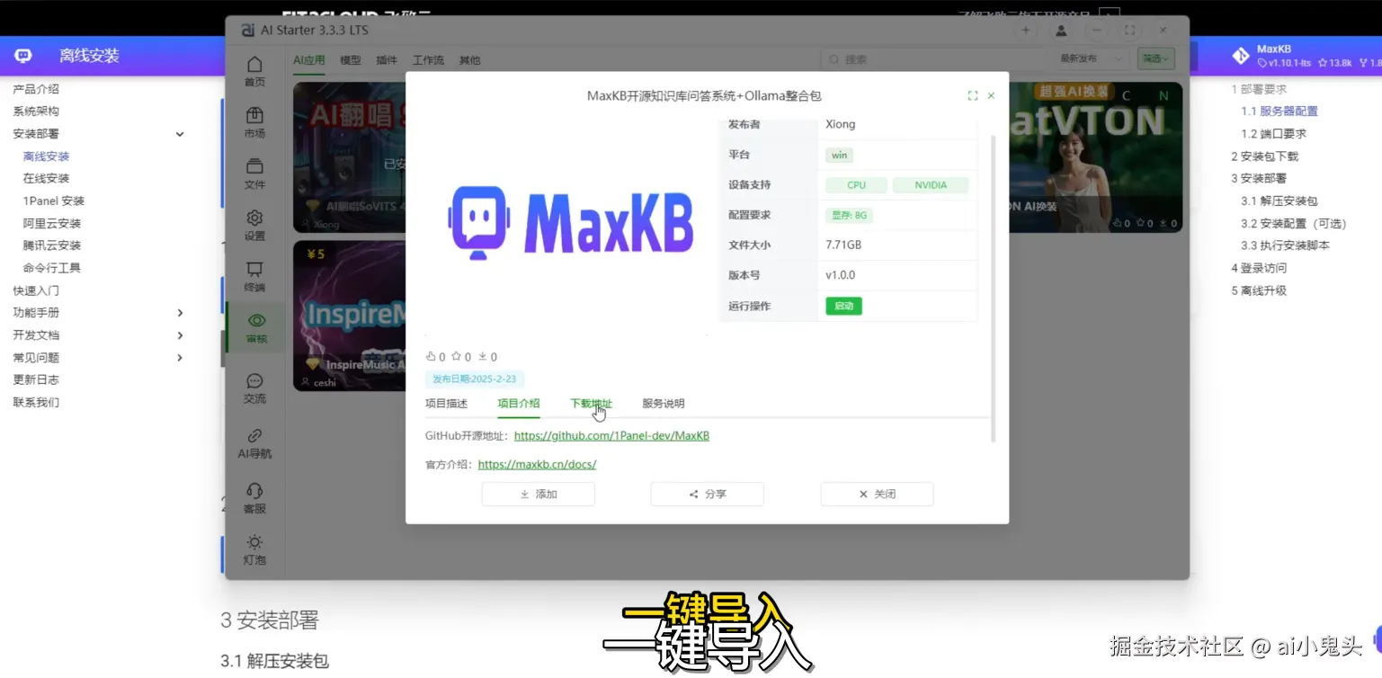 打开AIStarter工具,在市场中找到Max KB开源知识库问答系统 ,点击“添加”按钮即可将其添加到首页。如果尚未审核通过,也可以通过三方网盘地址离线下载并一键导入。