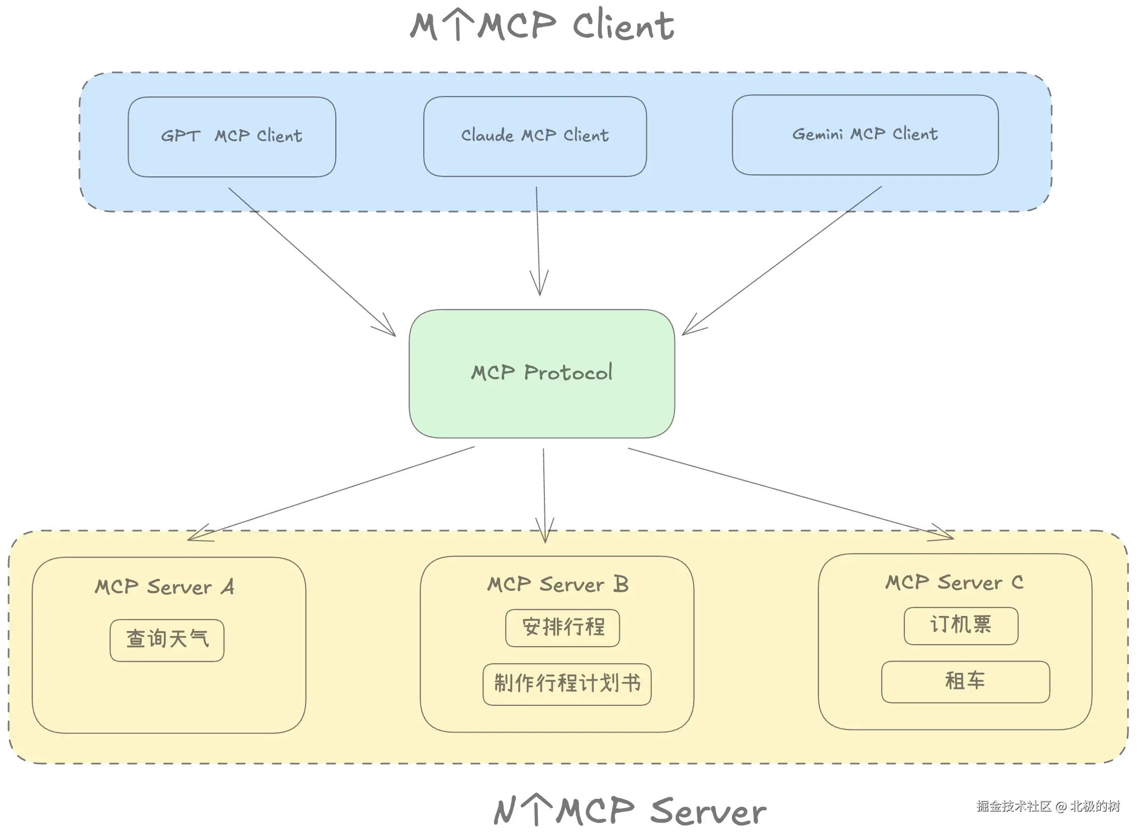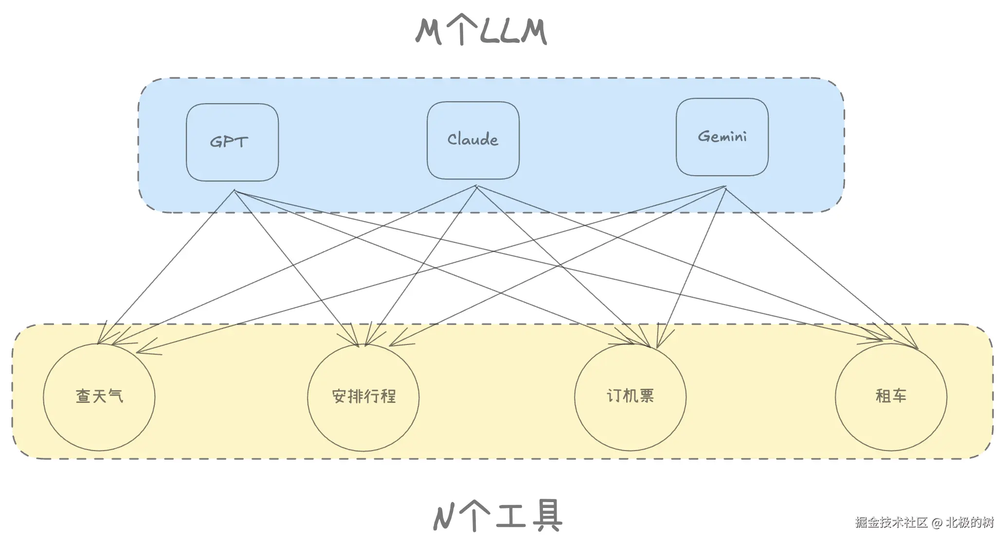 显而易见,Function Calling功能的推出,标志着LLM从一个纯粹的文本生成工具,转变为能够与外部世界进行交互的智能代理,这是LLM发展的一个重要里程碑。但与此同时,这也给开发者带来了新挑战。在开发具体的AI应用时,开发者不仅要从不同的LLM(M) 中选择合适的模型,还需要集成各种外部工具(N) 。这就形成了一个复杂的 “M x N”集成矩阵。更为麻烦的是,不同的LLM可能有不同的工具调用协议和接口标准,因此每种LLM与工具的组合都可能需要单独的适配工作。这大大增加了系统开发的复杂度和成本,也使得开发出的工具很难在不同系统间复用。
