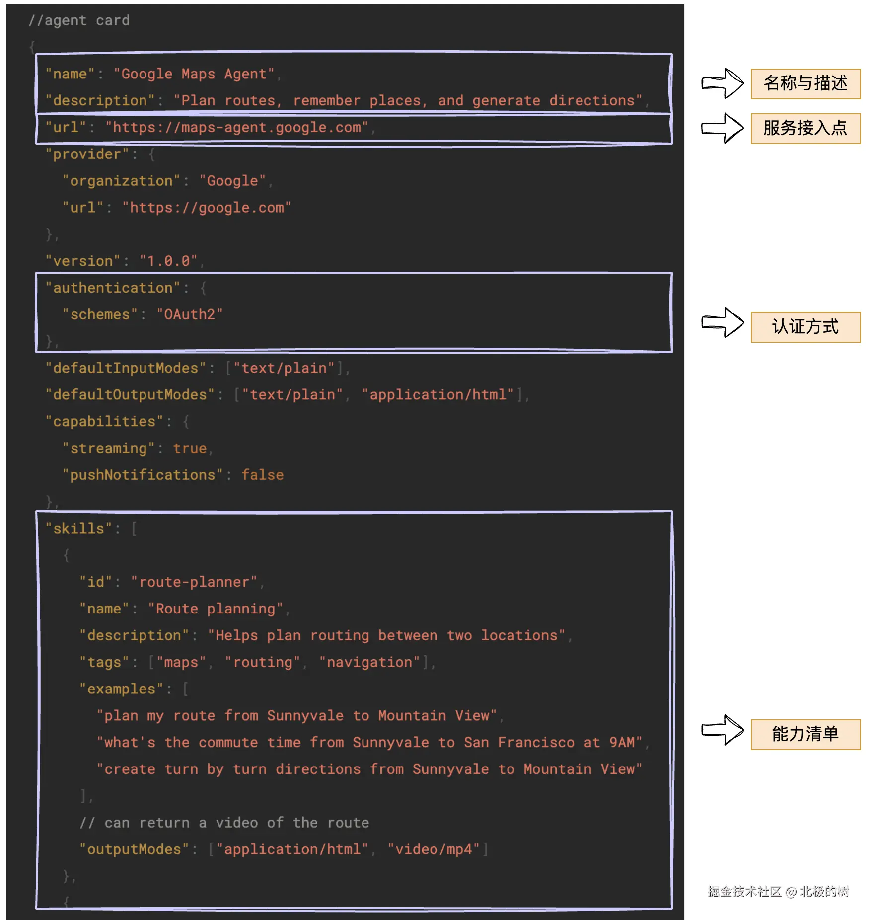 为了解决发现问题,A2A框架引入了 “Agent名片”(Agent Card) 的概念。这本质上是一种标准化的元数据描述文件,每个Agent都会发布自己的“名片”,让其他Agent能够查询和理解。这张“名片”通常包含以下关键信息: