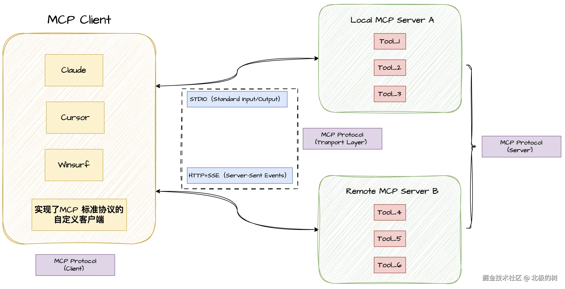 通过以上设计可以看出,任何通过MCP Protocol (Client)实现的标准MCP客户端,都可以通过MCP Protocol(Transport Layer)发现并调用MCP Protocol(Server)实现的工具。我们再来看文章第一部分中提到的问题通过MCP来实现时的方案: