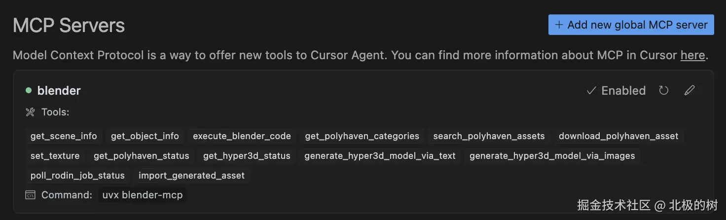 上图是我在Cursor(MCP Client)中配置的Blender MCP Server,这样我就可以通过自然语言与Cursor Agent进行交互,在Blender中创建3D模型。可以看到,当Blender MCP Server配置并成功连接后,MCP Client就能通过Server提供的list_tools接口获取到所有可用工具。接下来,当我在Cursor Agent下请求“帮我创建一个太空飞船的3D模型”时,MCP Client是如何选择调用哪个工具来完成任务的呢?