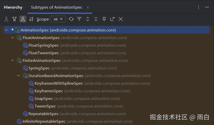 发现好多XxxSpec啊,而且不止这些,还有VectorizedAnimationSpec接口的继承树、DecayAnimationSpec接口的继承树、VectorizedDecayAnimationSpec接口的继承树、FloatDecayAnimationSpec接口的继承树。
