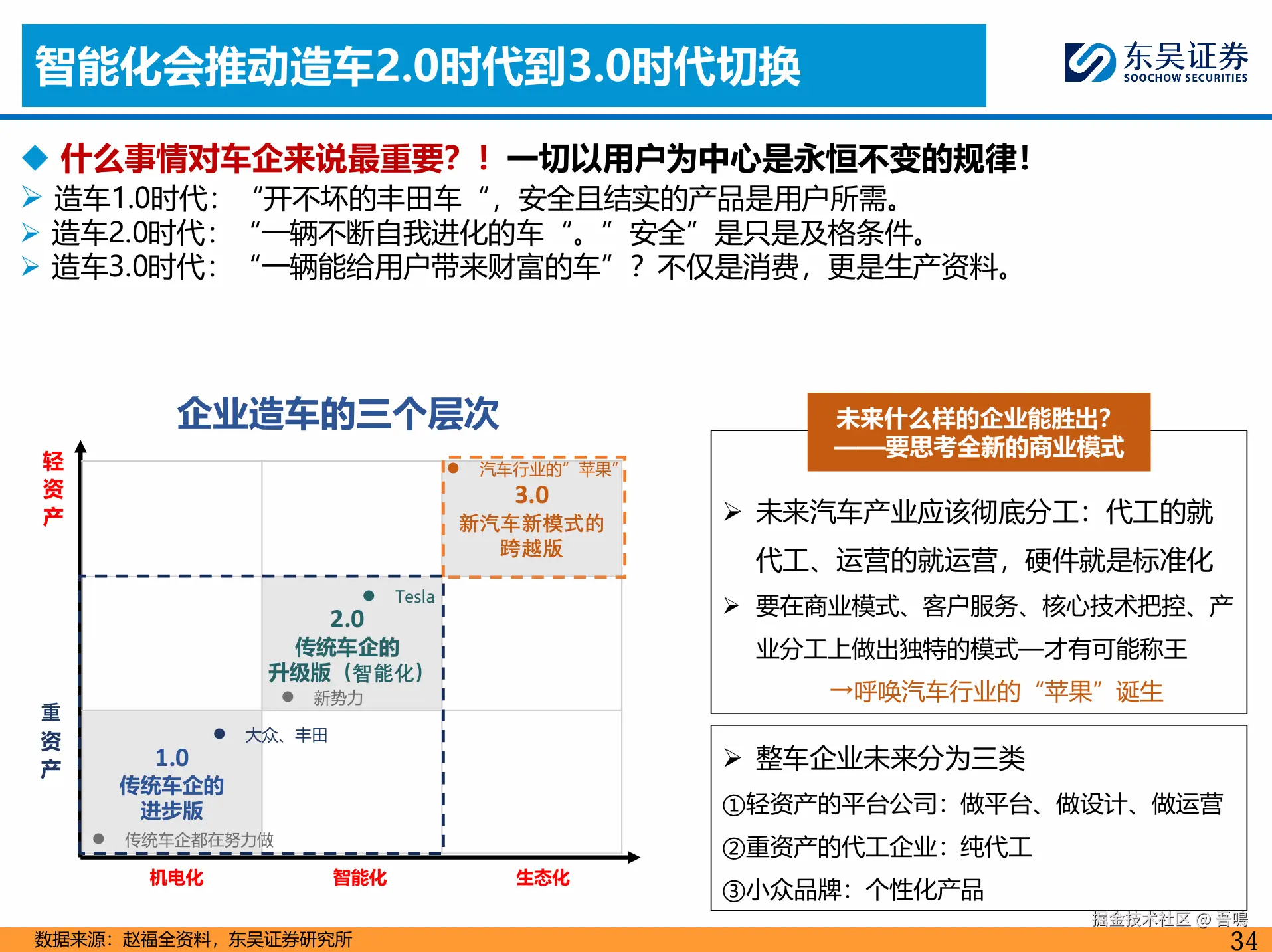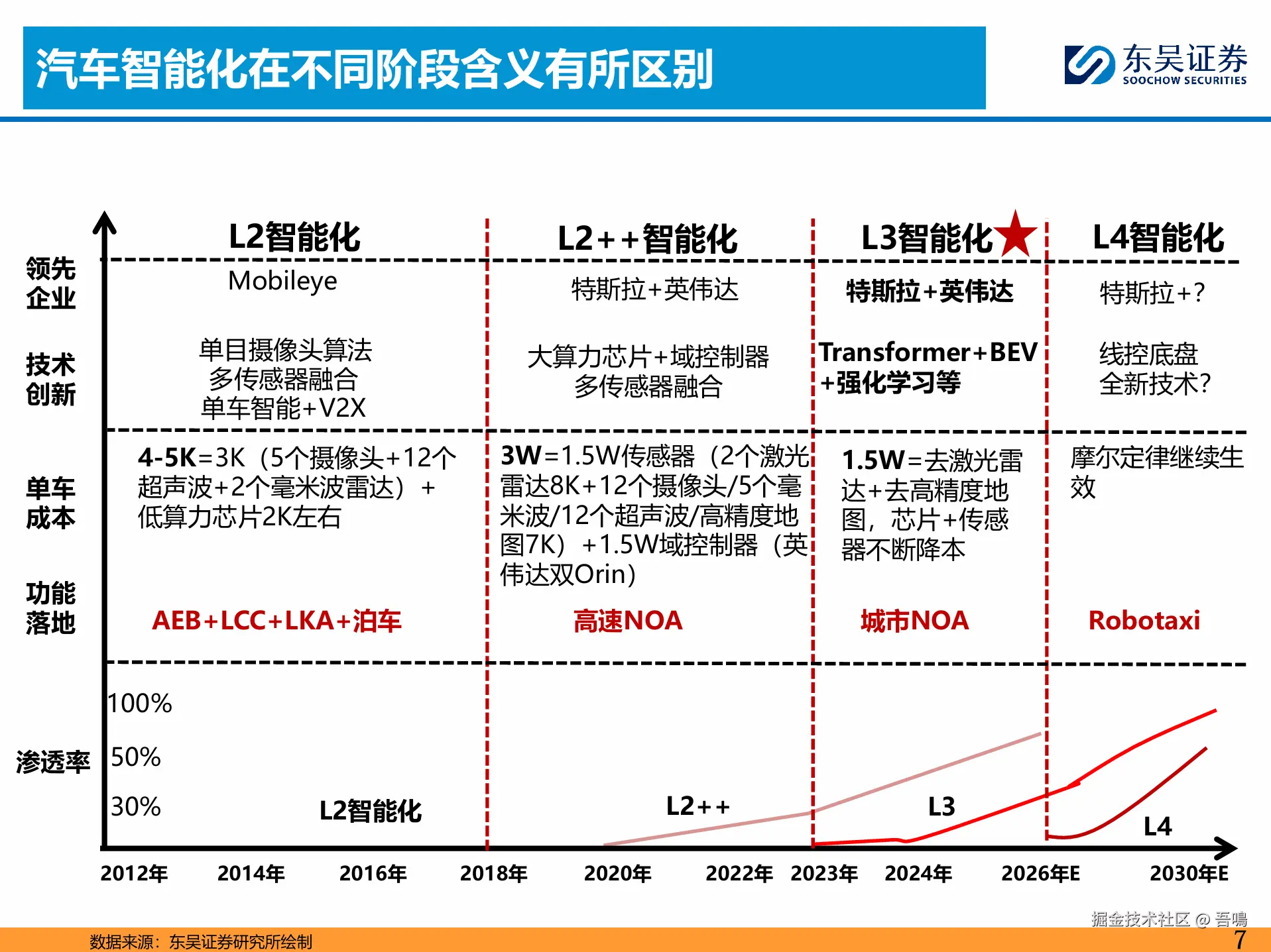 提出汽车智能化发展的“三部曲”:2025-2027年L3智能化推动电动车渗透率突破,2027-2030年L4 Robotaxi实现软件收费,2030-2035年自主品牌全球化。强调产业链将进入“淘汰赛”,强者恒强,利润分配模式类似消费电子。
