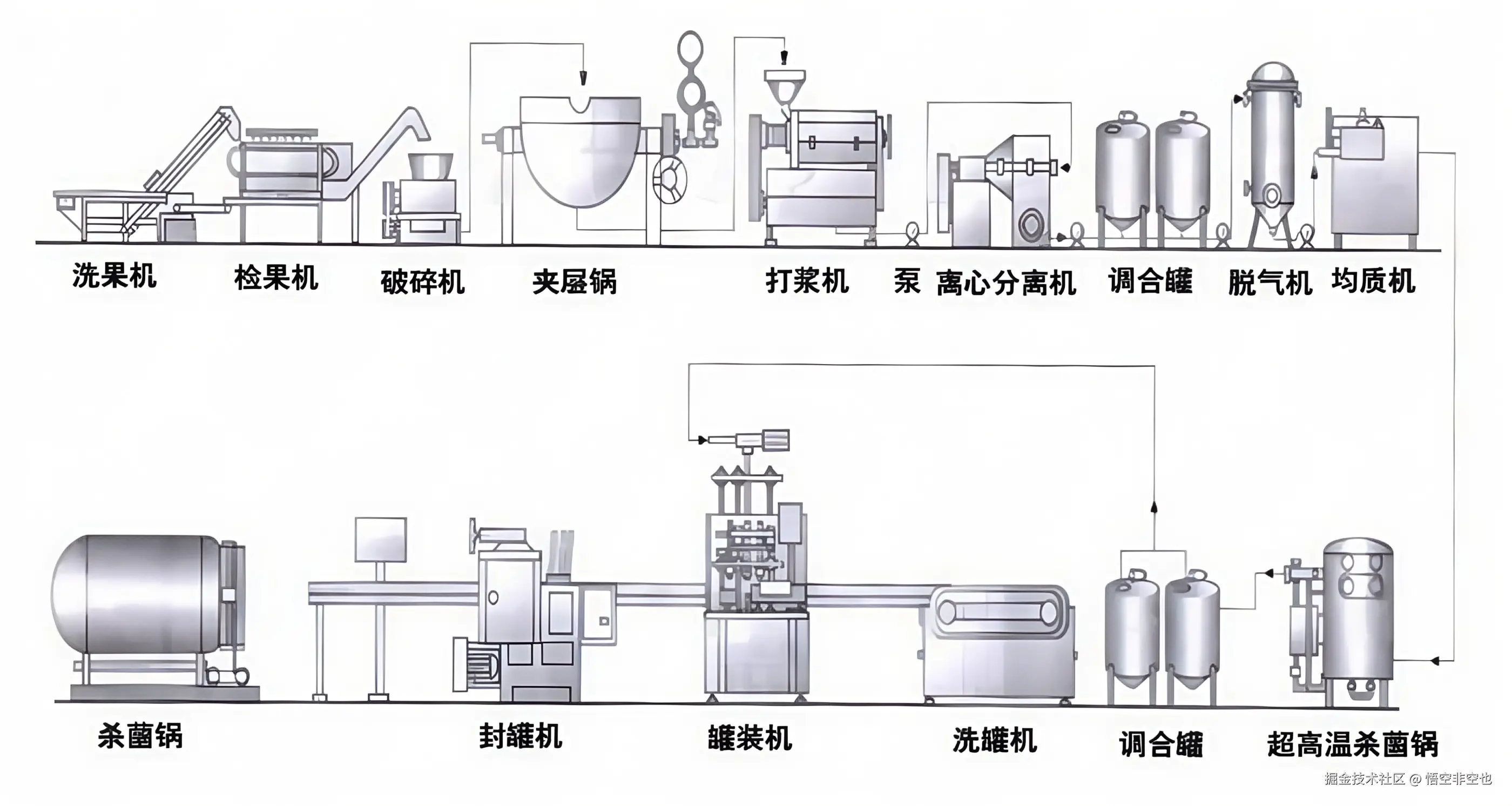 鲜榨浓缩果汁饮料生产工艺流程图 :洗果→检果→破碎→夹层→打浆→调配→......→封罐→杀菌。