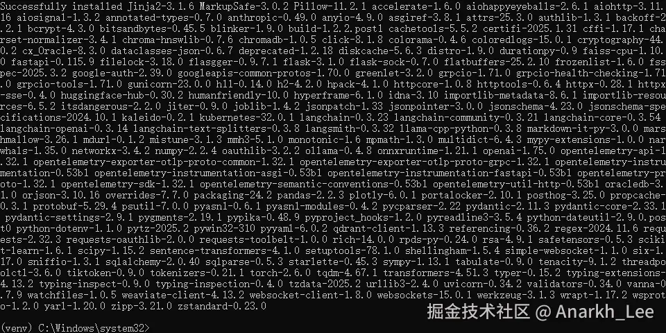 - 检查激活状态 (!!!): 必须看到终端提示符行首有 (venv) 标记。这表示虚拟环境已激活。如果未激活,请手动运行 .\venv\Scripts\activate 或重启终端。