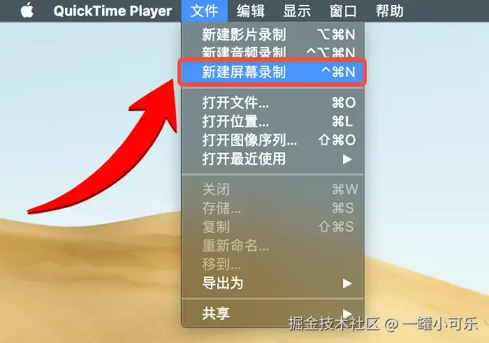 步骤1:打开QuickTime Player,在菜单栏里找到 “文件” 选项,然后选择 “新建屏幕录制” 。