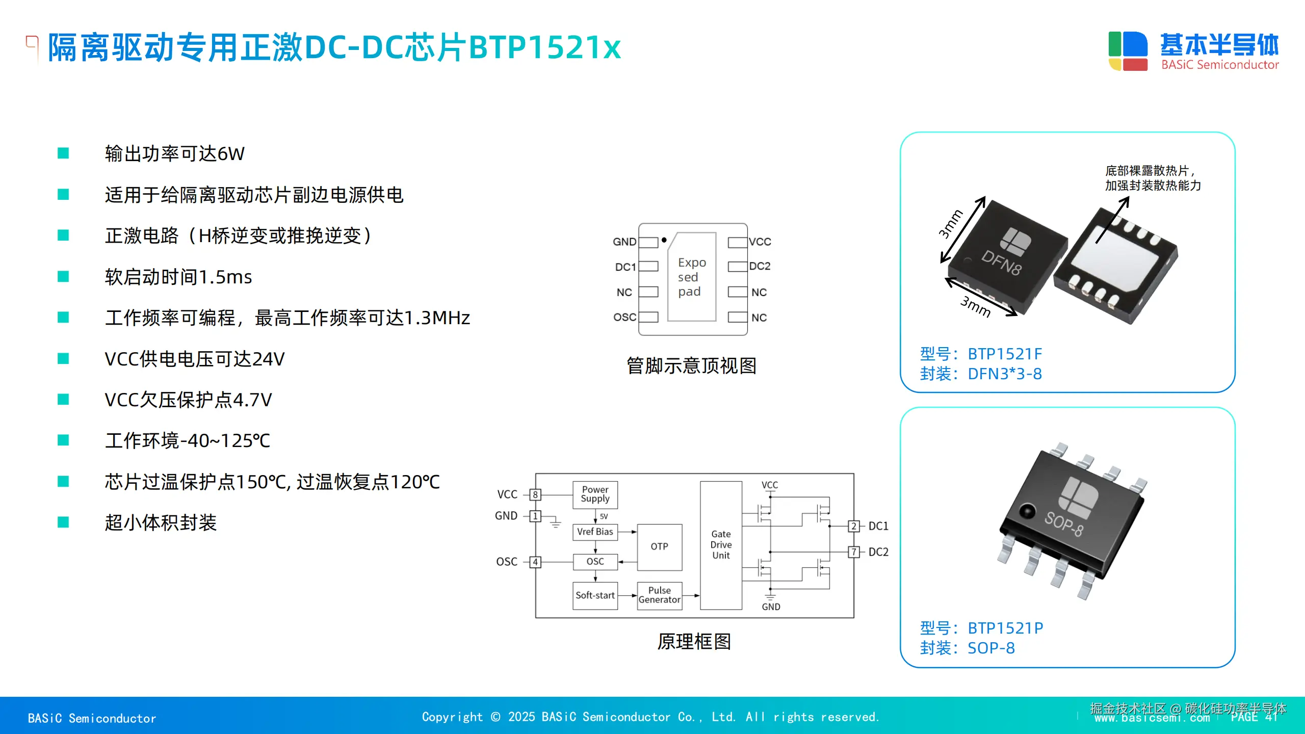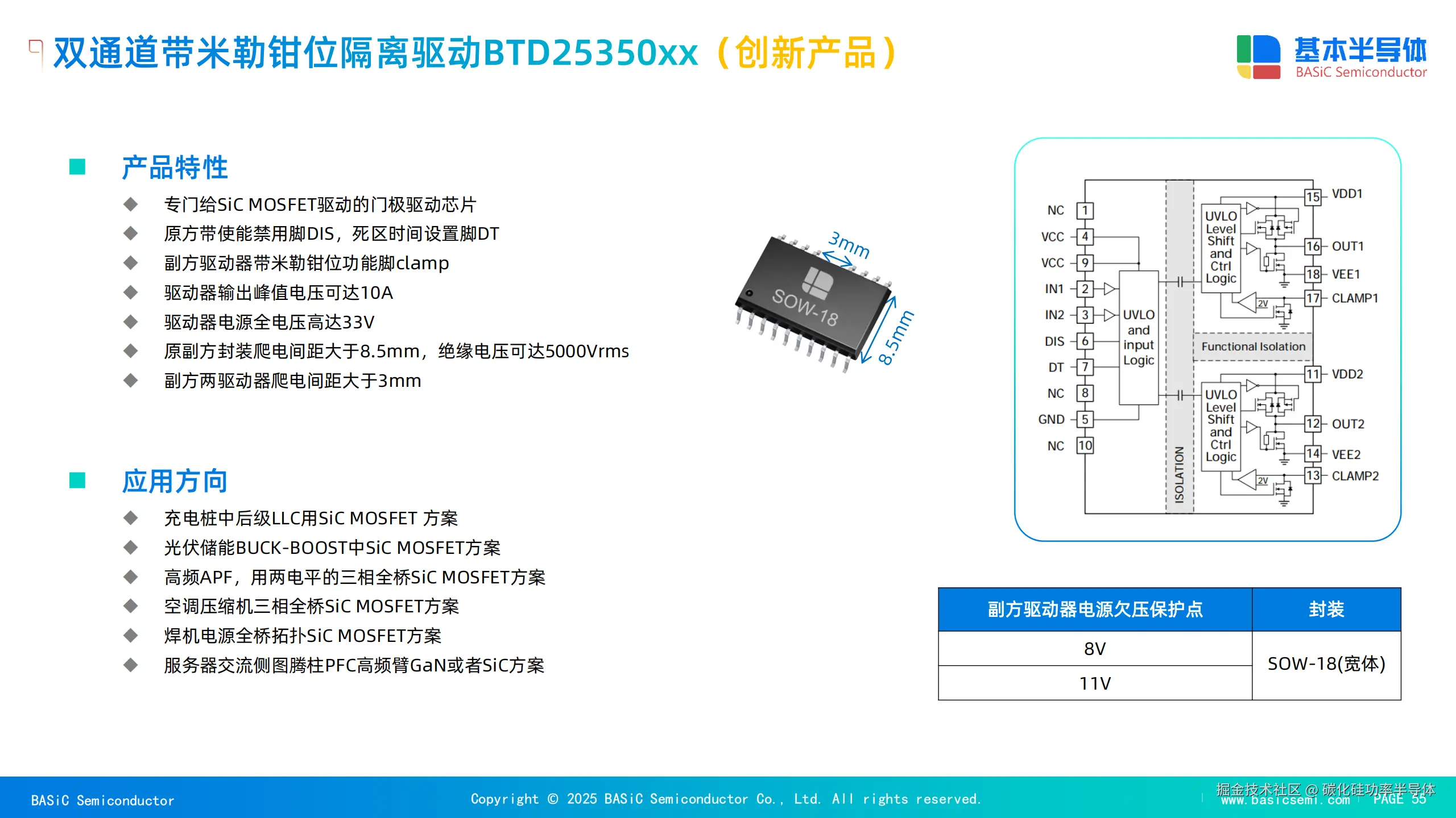 隔离驱动芯片:BTD5350MCWR,支持峰值电流10A,集成米勒钳位功能。