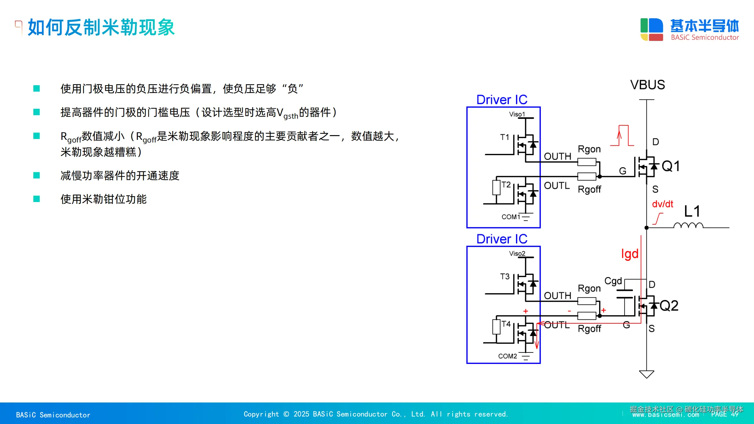 在桥式拓扑中,上管开通时产生的dv/dt通过下管寄生电容Cgd引发米勒电流(Igd=Cgd⋅dv/dt),导致下管门极电压抬升。SiC MOSFET因低阈值电压较低(高温下更低),更易因米勒电流误开通。