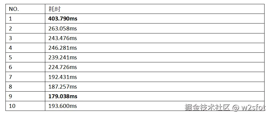 去掉最高值和最低值,平均耗时:223.75875ms(毫秒)。