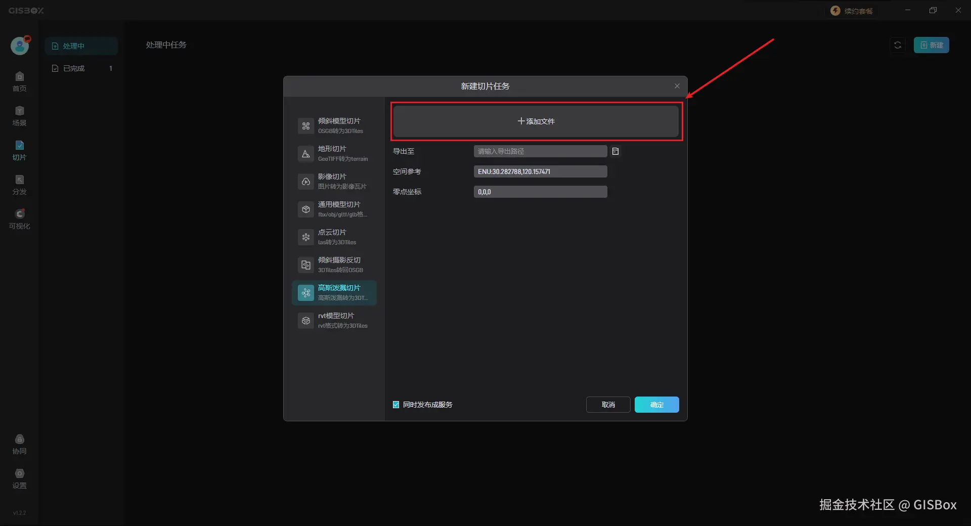 首先打开GISBox软件,在左侧切换到 “切片” 功能,点击右上方的 “新建” 按钮创建一个切片任务。