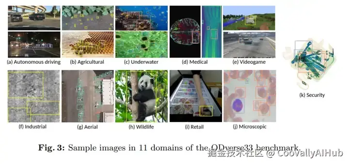 为了打破“COCO数据集霸权”,论文团队构建了ODverse33基准测试,覆盖自动驾驶、农业、水下、医疗、游戏、工业、航空、野生动物、零售、微观、安全的11个真实场景,其中包括398万个实例。