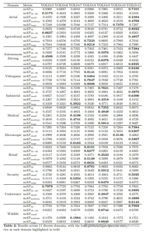 虽然YOLOv11综合指标排名第一,但也仅在6个领域(如农业、自动驾驶)表现最佳。或许有人会问到底该如何选择模型呢,该论文也是给出了一份“领域适配清单”: