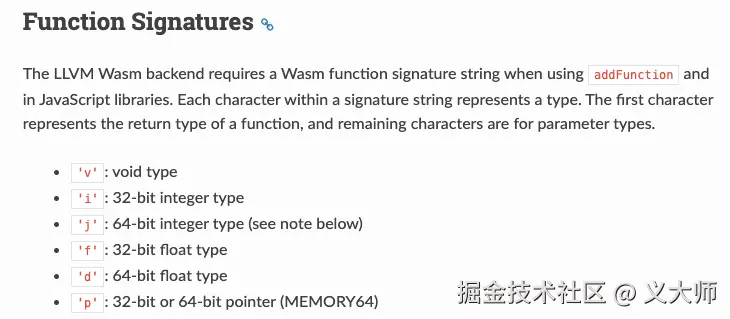 通过addFunction这个方法,我们我们声明的handleYUVData作为一个函数指针传入到wasm作为一个函数指针调用。viii 这里代表的意思,第一个参数代表void,代表函数无返回,i代表的32位的int类型。