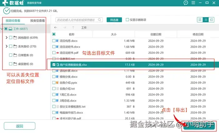 步骤2: 在软件扫描完成后,在扫描出来的文件列表中选出目标文件,勾选好后点击【导出】;