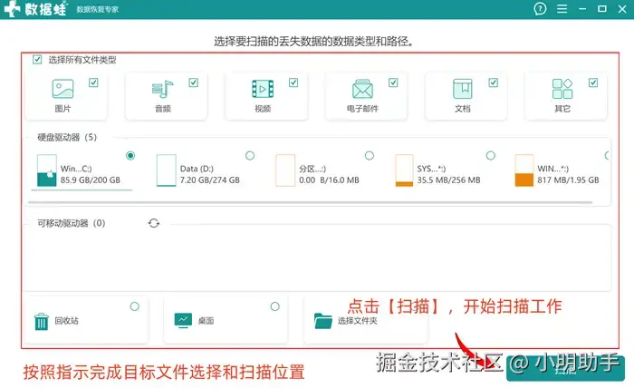 步骤1: 进入软件首页后,选择误删的文件类型,再选择误删电脑文件的位置,点击【扫描】;
