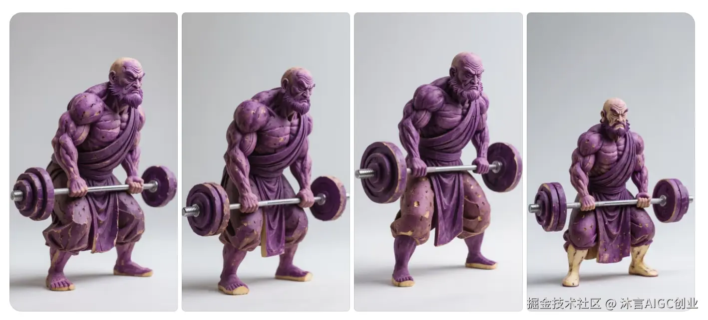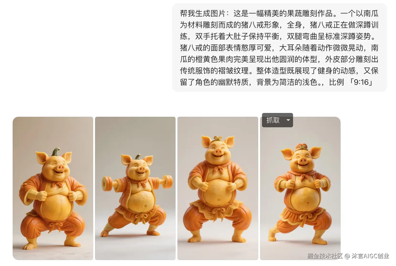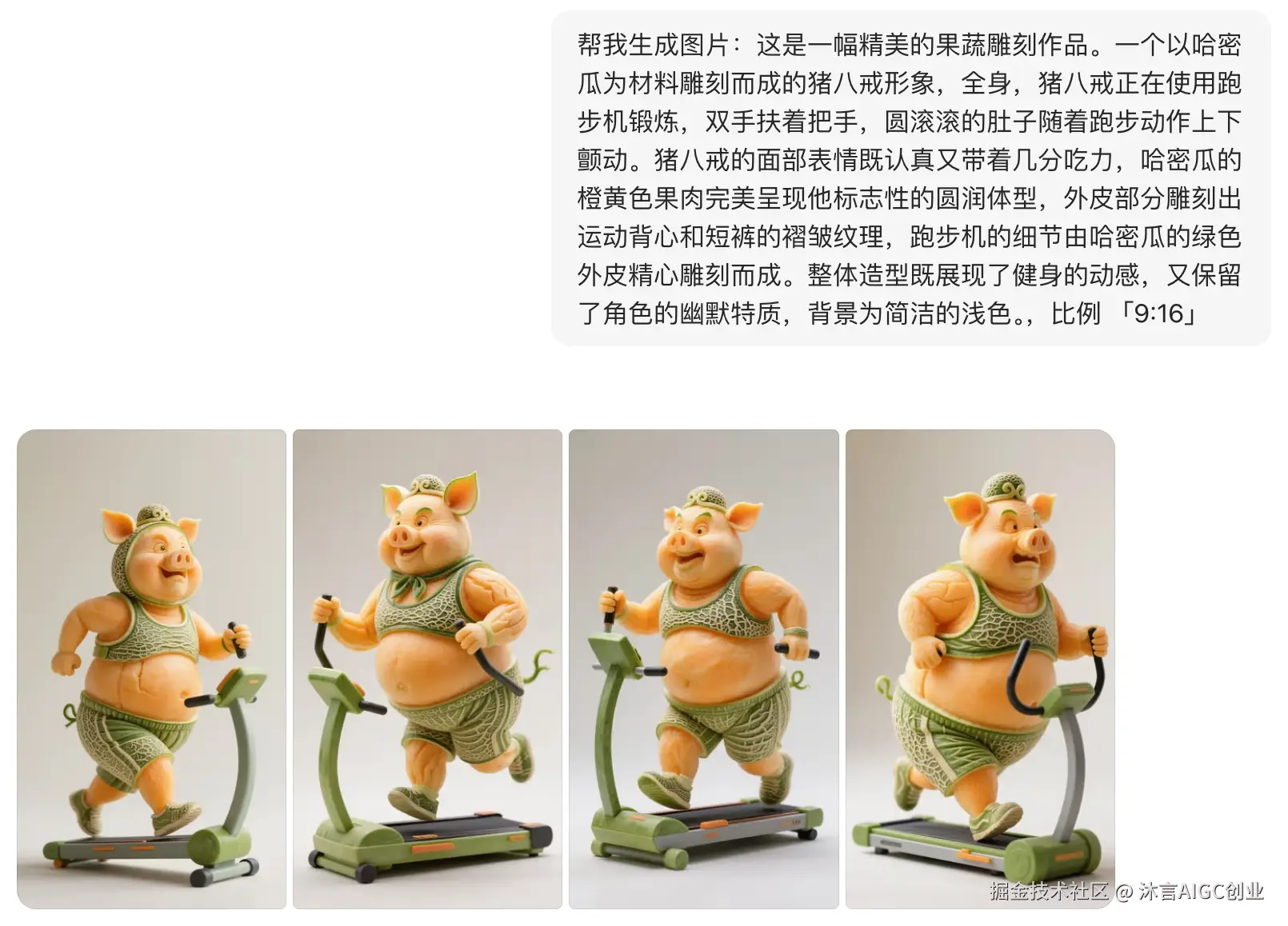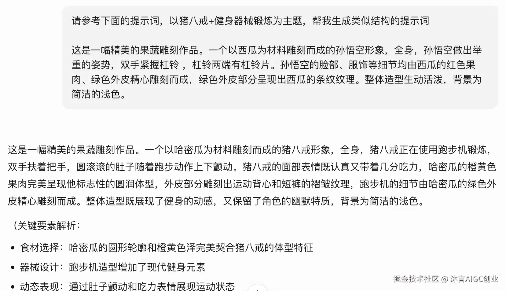 第一步我们已经完美复刻了孙悟空+健身器械锻炼的场景,我们发挥一下创意:是否可以复刻猪八戒、沙僧等健身锻炼的场景呢?我们在腾讯元宝中使用如下提示词,让AI帮我们仿写猪八戒的提示词: