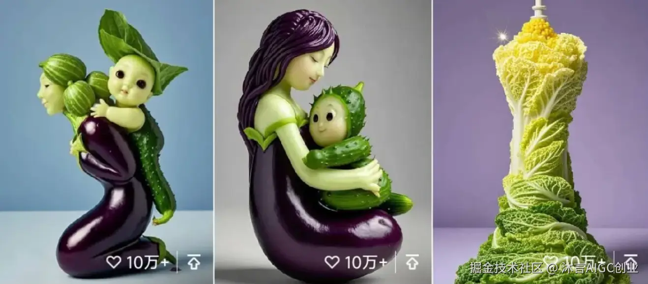 刷短视频时,你有没有被惊艳到?茄子、黄瓜、白菜等蔬菜,在 AI 的 “魔法” 下,竟能变成创意十足的艺术作品,如图中茄子与黄瓜塑造的温馨亲子形象,还有造型独特的白菜作品 ,这类视频点赞轻松 10W+。