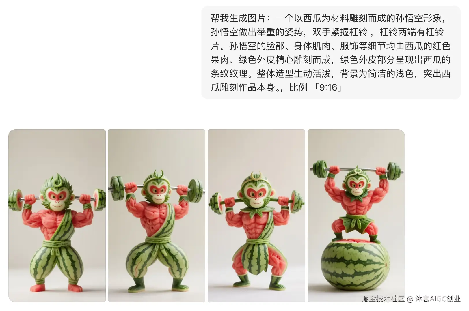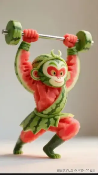 这是一幅精美的果蔬雕刻作品。一个以西瓜为材料雕刻而成的孙悟空形象,全身,孙悟空做出举重的姿势,双手紧握杠铃 ,杠铃两端有杠铃片。孙悟空的脸部、服饰等细节均由西瓜的红色果肉、绿色外皮精心雕刻而成,绿色外皮部分呈现出西瓜的条纹纹理。整体造型生动活泼,背景为简洁的浅色。
