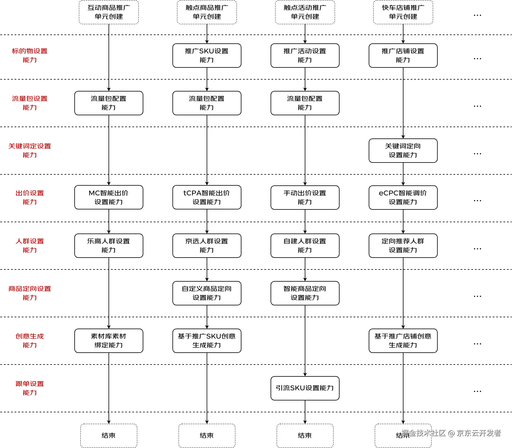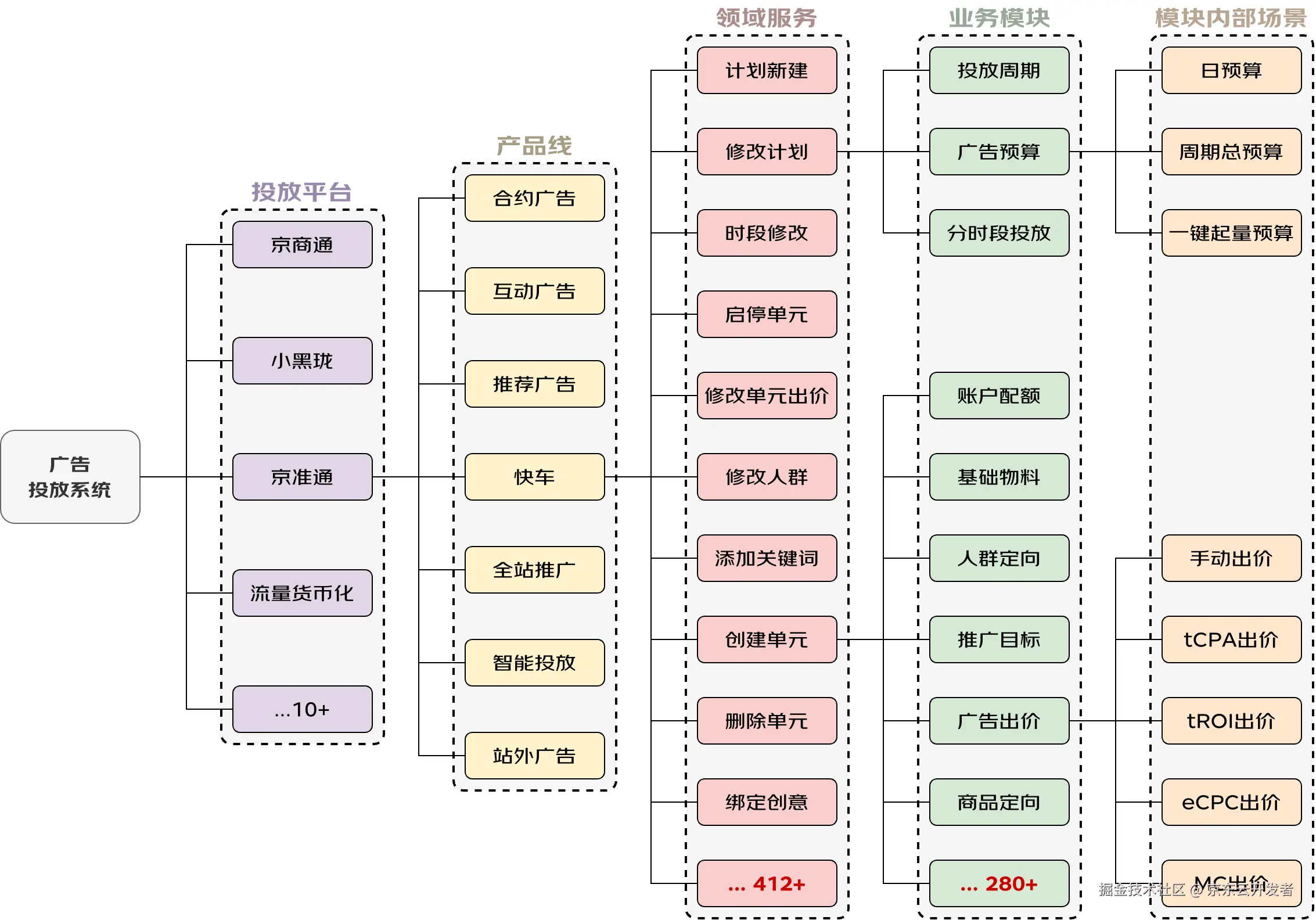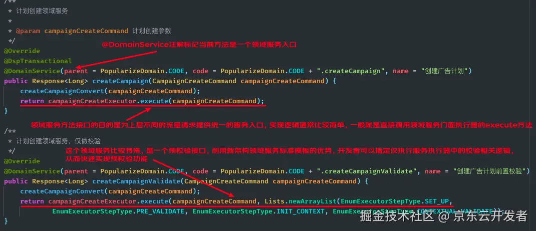 前言:信息时代技术更迭和传播速度不断加快,技术变得泛娱乐化,大数据、云计算、区块链、元宇宙、大模型,一代代技术热点在社会舆论的裹挟之下不断地吸引着资本的眼球,技术人员为了不被时代所淘汰也不得不时刻追赶潮流。在这样一个时代背景下,软件工程作为一门不起眼到有些枯燥的古老学科,似乎早已被开发者们遗忘在角落。作为一名技术人员我们自然应该时刻保持对前沿技术的追踪,然而,当发生线上问题我们却面对着成片的屎山代码毫无头绪时;当业务方提出个性化需求我们却因为不敢对系统做出修改而强迫对方做出妥协时;当一次请求处理流程中出现多达数万次重复地数据库操作而影响到整个系统的稳定性时,大家都应该沉下心来思考一下,我们是不是忘记了作为一名程序员的初心和对代码的极致追求。 还记的当年我抱着朝圣的心态从传统行业踏入京东职场时的兴奋与期待,然而这份期待很快就被四处可见的屎山代码给浇灭了,后来从朋友口中了解到其他头部互联网厂商的业务系统其实也是半斤八两。这似乎是软件行业中的一个电车难题,一边是无尽的业务需求和倒排的工期,一边是补丁摞补丁的糟糕代码,是继续泡在酱缸中缝缝补补还是向屎山代码说不,开发人员被困在中间不知该如何抉择。然而事实上,追求整洁架构与提升研发效率之间从来就不是一个悖论。正如Robert C.Martin在其著作《Clean Architecture》中所说:“不管你多敬业、加多少班,(在面对烂系统时)你仍然会寸步难行,因为你大部分的精力是在应对混乱(而不是在开发需求)。”造成我们整日加班赶需求和疲于应对线上问题的根本原因,恰是那些不被我们重视的糟糕代码。业务天然就是复杂的,这决定了软件系统的本质复杂度(Essential Complexity),这种复杂度是无法通过软件架构去消除的。那么解决上述问题的关键就是找到某种架构去引导开发者对复杂业务进行问题拆解,分而治之,在这个基础上再通过标准规约和工具约束及辅助开发者写出可理解、易拓展、好维护的代码,以此来对抗软件系统本身的偶然复杂度(Accidental Complexity,Frederick P.Brooks,Jr, 《The Mythical Man-Month》)。 为了找到这样的一种架构,我们从19年就开始对各类架构思想和实践案例进行了深入地学习和探索,并在接下来的3年时间里通过局部架构演进的方式进行了大量的实践验证,在这个过程中我们对这些架构思想的理解也从早期的懵懂教条式执行逐渐做到了如今的融汇贯通,并最终在22年底形成了一套成体系的框架及方法论,并在京东广告投放平台重构工作中进行了实战应用。本文也将以广告投放平台架构升级作为背景案例,从设计思想到落地框架,循序渐进地为您介绍这套新架构的诞生始末,而这套架构思想的演进历程则在《改进我们的架构》一文中有详细的阐述。