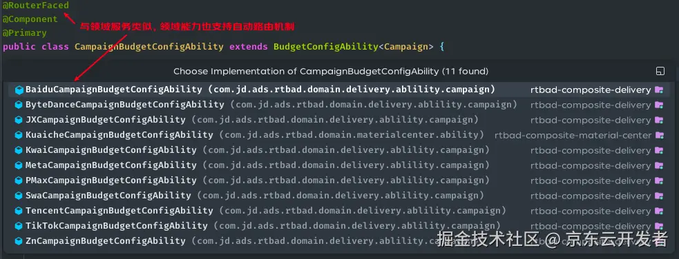 拓展点的作用是作为任意维度的差异点补充分离工具。需要注意的是在新架构中拓展点不是唯一的差异分离工具,在通用对象发现及路由机制下,领域服务、领域能力和拓展点都在不同维度上起着差异点分离的作用。相对与前两者拓展点更加灵活,通常用来承接领域服务及能力自身路由维度之外的逻辑差异。比如出价设置能力已经按照出价方式做了能力维度的差异分离,但是在相同的出价方式下,京准通与流量货币化还存在一些细微的逻辑差异,那么这个时候就可以在该能力实例中通过拓展点来补充实现平台维度的差异逻辑分离。