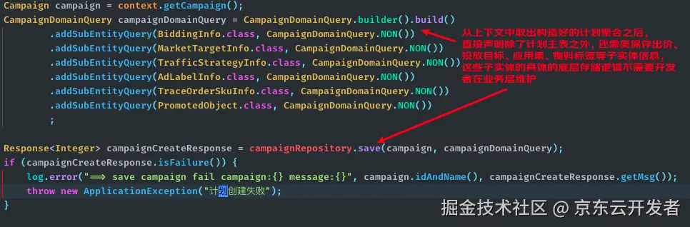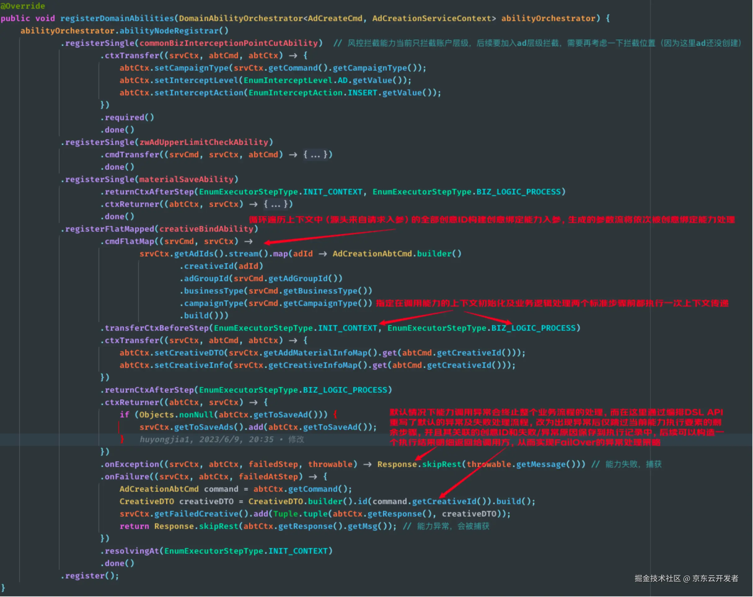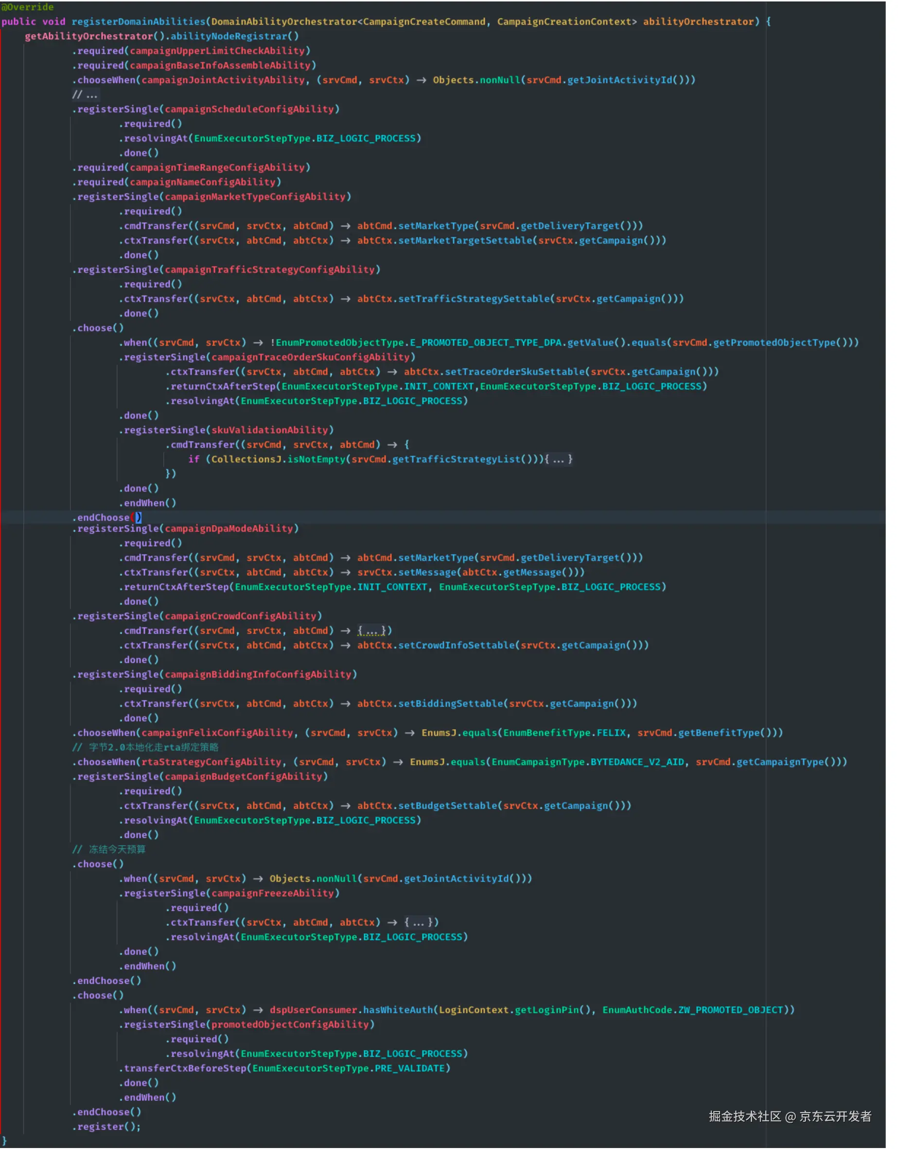 下图给出的是一个站外字节广告计划创建请求处理流程对应的领域能力执行图构建逻辑,可以看出能力编排DSL仅用数十行代码以一种近乎白话文形式描述出了完整的计划构建过程:首先对用户已创建计划数量进行上限检查(CampaignUpperLimitCheckAbility);上限校验通过后会构造出一个空的计划对象并为其填充用户ID、计划类型等基础信息(CampaignBaseInfoAssembleAbility);然后判断本次计划创建请求是否在参数中设置了联合活动ID,如果联合活动ID不为空则需要执行联合活动信息设置相关的业务逻辑(CampaignJointActivityAbility);完成联合活动信息设置之后就要依次设置计划的投放周期(CampaignScheduleConfigAbility)、计划名称(CampaignNameConfigAbility)、营销目标(CampaignMarketTypeConfigAbility)、应用集(TrafficStrategyConfigAbiliy)等模块的相关属性,需要注意的是在上述几个能力的编排逻辑中,由于领域能力的参数或上下文对象中的属性名称与领域服务的参数及上下文中相应属性并不匹配,默认的参数及上下文数据传递机制将无法为这几个属性设值,因此开发者对营销目标设置能力的参数传递(cmdTransfer)、上下文传递(ctxTransfer)、应用集设置能力的上下文传递(ctxTransfer)逻辑进行了自定义拓展,手动实现了参数及上下文中特殊属性的数据映射逻辑;在完成这些业务模块的属性设置之后,如果请求参数中设置的标的物类型为“商品库”,那么接下来就要执行与站外DPA广告业务相关的特殊业务环节:推广SKU的校验(SkuValidateAbility)以及SKU跟单信息的配置(TraceOrderSkuConfigAbility)逻辑......