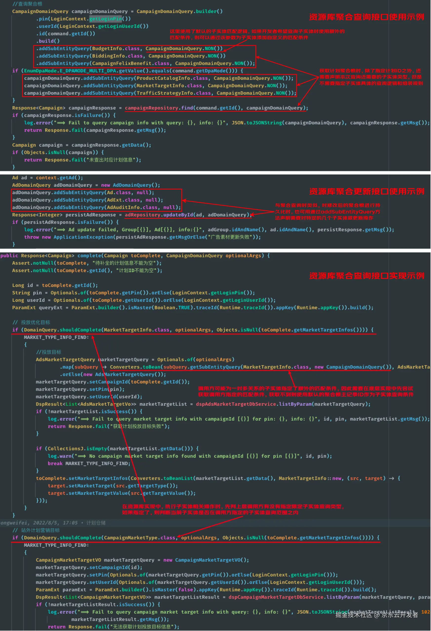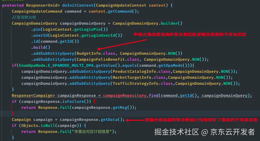 在《能力编排领域特定语言》章节中我们已经对声明式编程有了比较具象的体会,但声明式编程并不限定于领域特定语言这一种实现形式,在资源库的接口设计上我们采用了一种更加朴素的声明式编程实现方法。如下图所示,我们计划聚合的查询以及创意聚合的更新接口为例来阐述声明式数据操作的设计细节。当需要从资源库中获取聚合根对象时,默认情况下资源库库会自动查询聚合下所有子实体并完成组装,但是开发者可以再提供一个额外的辅助查询参数DomainQuery,并通过该对象的addSubEntityQuery方法声明希望获取哪些特定的子实体。默认情况下资源库会根据聚合根对应的主表记录ID做子实体查询,如果开发者希望在子实体查询时使用额外的匹配条件,则可以通过addSubEntityQuery方法同时声明希望获取的子实体类型以及执行该类型子实体查询时使用的额外匹配参数,这一特性在与聚合根存在一对多的子实体查询场景中会发挥重要作用。上述声明式接口在资源库实现中并不复杂,只需要在执行每个子实体的查询或修改操作之前,判断一下上层调用方是否限定了仅对部分子实体进行操作,如果设置了则进一步判断当前子实体是否在上层调用方指定的子实体范围之内,如果当前子实体业务上允许调用方指定自定义的匹配逻辑,还需要尝试从辅助查询/修改参数中提取调用方为该子实体指定的自定义匹配逻辑。需要特别说明的是,我们不推荐在新架构内部各个模块之间采用任何形式的黑盒调用模式,不管是能力编排还是资源库调用,上层调用方都有责任和义务理清底层模块的内部执行逻辑,确保编排配置或调用参数设置正确。