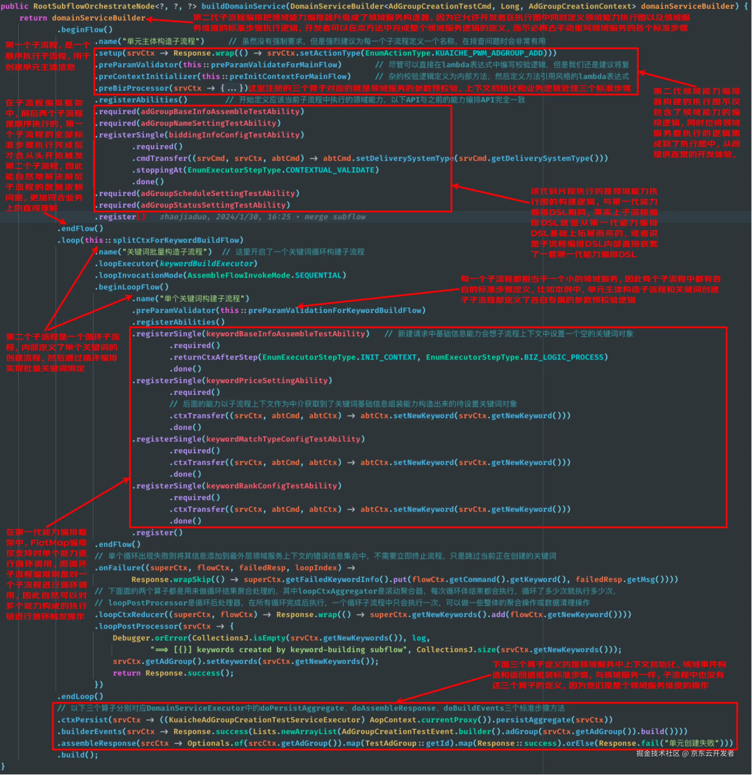 为了更好地适配业务发展趋势,同时解决上文提到的第一代能力编排框架中由于领域服务与领域能力执行图之间逻辑分离定义、需要手动硬编码完成串联造成的业务逻辑割裂、会引入大量重复的胶水代码等问题,我们在第一代能力编排框架的基础上进行了升级,引入了子流程编排机制。子流程编排最重要的升级是增加了分阶段集成的特性,这也与当下多接口集成的业务发展趋势相符,一个完整的请求处理流程可以被拆分为不同的执行阶段,后置阶段的执行逻辑可能依赖于前置阶段的执行结果。PICASO框架允许开发者通过子流程编排DSL将一个完整的业务流程拆分定义为多个业务处理阶段,其中每一个业务处理阶段被称为一个子流程,每一个子流程可以看做是一个小的领域服务,有各自专属的标准处理步骤及领域能力执行图。除了可以像第一代能力编排框架那样为每一个子流程定义专属的领域能力执行图之外,第二代子流程编排框架还让开发者不需要再去重写领域服务执行器标准模板中的各个标准步骤,而是通过子流程编排DSL将每个子流程专属的参数预校验、上下文初始化、上下文校验及业务逻辑处理四个标准步骤与领域能力执行图一起直接定义到子流程执行图中,从而彻底解决了第一代能力编排框架中领域服务维度的业务逻辑与能力执行图开发割裂的问题。也正因为如此我们在第二代子流程编排DSL中将第一代编排框架中的领域能力编排器(DomainAbilityOrchestrator)升级成了领域服务构造器( DomainServiceBuilder ) 。