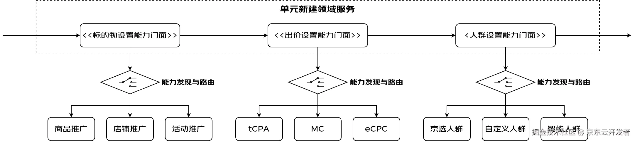 只是把业务流程按照功能边界拆分成不同的模块通常是不够的,因为单个模块内部往往还存在细分的业务模式,如上图中的出价设置模块,其内部还存在手动、MC、tCPA、eCPC等不同的出价模型,这个时候就需要根据分类思想进行进一步拆解。分类思想是关注点分离思想进一步的延伸,它在分离的同时还注重元素之间的共性特征。当模块内部出现场景分化时,PICASO框架建议开发者对模块进行进一步细分,将模块内不同场景的业务规则封装为不同的能力实例。这些能力实例之间尽管存在逻辑差异,但是毕竟属于同一个原子业务模块,在数据模型、接口协议乃至业务流程上都存在很大的相似度。因此PICASO会将同模块下不同业务场景对应的领域能力实例聚合到一起,这样的一组能力被称为一个能力节点。同一个能力节点下的各个能力实例使用相同的接口参数及上下文定义,每个能力节点下会额外定义一个能力门面,能力门面通常不承载具体的业务规则,它仅负责定义当前能力节点对外的接口协议以及从请求参数中提取业务场景标识的逻辑,它是能力节点下所有能力实例对外提供服务的统一入口。上层的领域服务组合领域能力时,引用的不是具体的领域能力实例,而是各个能力节点下的能力门面。PICASO框架内置的可执行实体发现与路由机制会在应用启动时扫描出系统中所有的能力门面,并建立好能力门面与各个能力实例的路由表。当请求到来时,领域服务不必关注本次请求应该使用哪个具体的能力实例,而是直接调用能力门面的统一入口,PICASO框架会通过内置的可执行实体发现与路由机制提取请求中的场景标识,然后将请求路由到对应的领域能力实例上,从而实现模块内部的场景复杂度与领域服务模块集成复杂度之间的解耦。以出价模块为例,出价模块内部会根据不同的出价类型细分为tCPA、MC、eCPC等智能出价能力实例,但是单元新建领域服务并不会直接操作这些具体的能力实例,它引用是出价设置能力门面。当请求到来时,PICASO框架会根据请求中的出价类型自动将请求路由到相应的能力实例上。可执行实体发现与路由机制是PICASO框架内置的一个底层通用组件,是能力编排、拓展点机制等顶层功能的基础。其本质上就是一个增强型的门面+策略模式,我们通过一些实现技巧将其做成了一个可以适配任意可执行实体的通用组件。如下图所示,单元新建业务流程涉及标的物设置、出价设置及人群设置等业务环节,这些业务环节内部都有各自的细分场景。在代码实现中,这些业务环节被抽象为3个能力节点,节点内部的细分场景被隔离到不同的能力实例中,在构建领域服务时就不需要考虑当前各个能力节点下的细分逻辑,只需要专注于业务流程本身,实现各个能力门面的组装逻辑即可。