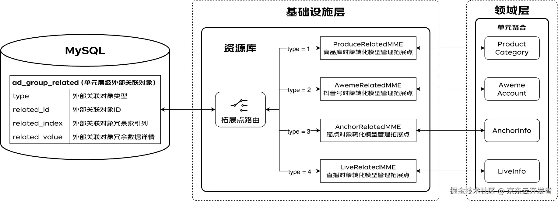 下图给出了一个广告投放业务中聚合实体与底层库表结构设计的例子,投放系统作为一个业务集成平台需要不断地对接各种垂直业务系统,在广告物料中也需要不断集成各类业务实体,这些数据也需要保存到底层的广告物料数据中。在设计单元聚合时,我们会紧贴业务实际为各类外部关联对象定义含义明确的聚合实体:商品库(ProductCategory)、抖音账号信息(AweneAccount)、展示锚点信息(AnchorInfo)、直播信息(LiveInfo)等,从而确保领域模型与实际业务的统一。但是在设计底层库表结构时为了避免库表结构膨胀以及表字段稀疏化,我们采用了通用化的存储结构:绑定到广告物料上的不同外部业务对象都保存到同一张外部关联对象表中,该表中的字段采用泛化设计,不与任何一种特定的外部业务对象相绑定,而是通过type字段确定本条记录对应的外部对象类型以及表中其他字段的实际业务含义,业务层对这些外部业务对象读写操作都要通过资源库集中维护的底层数据记录与领域层聚合实体之间的映射逻辑做转换。需要特别说明的是,在新架构中我们将PICASO框架中的拓展点机制延伸到了基础设施层,引入了模型管理拓展点(Model Manage Extension, MME) 来实现聚合组装主流程与底层数据对象转换逻辑的解耦。在本例中,我们将外部关联对象表对应的PO对象与领域层聚合实体之间的映射逻辑抽离成了一个模型管理拓展点,以外部关联对象类型作为路由键,通过PICASO框架的通用可执行实体发现与路由机制实现具体拓展点实现的自动定位。可以看出资源库的存在不仅让开发者可以聚焦业务实际设计领域模型,让代码直接反映业务实际,同时还让通用化的底层数据存储结构得到更加广泛的应:库表结构的通用化设计虽然能够解决数据库模型膨胀的问题,但是也的确降低了数据模型对业务的表达能力,而且如果让上层业务直接操作这些库表,势必会造成代码逻辑不明、编码繁琐的问题。然而资源库却通过收口底层数据对象与上层业务实体之间的转化逻辑很好地解决了这些问题,让我们在采纳这种通用化的数据存储结构设计时少了很多顾虑。
