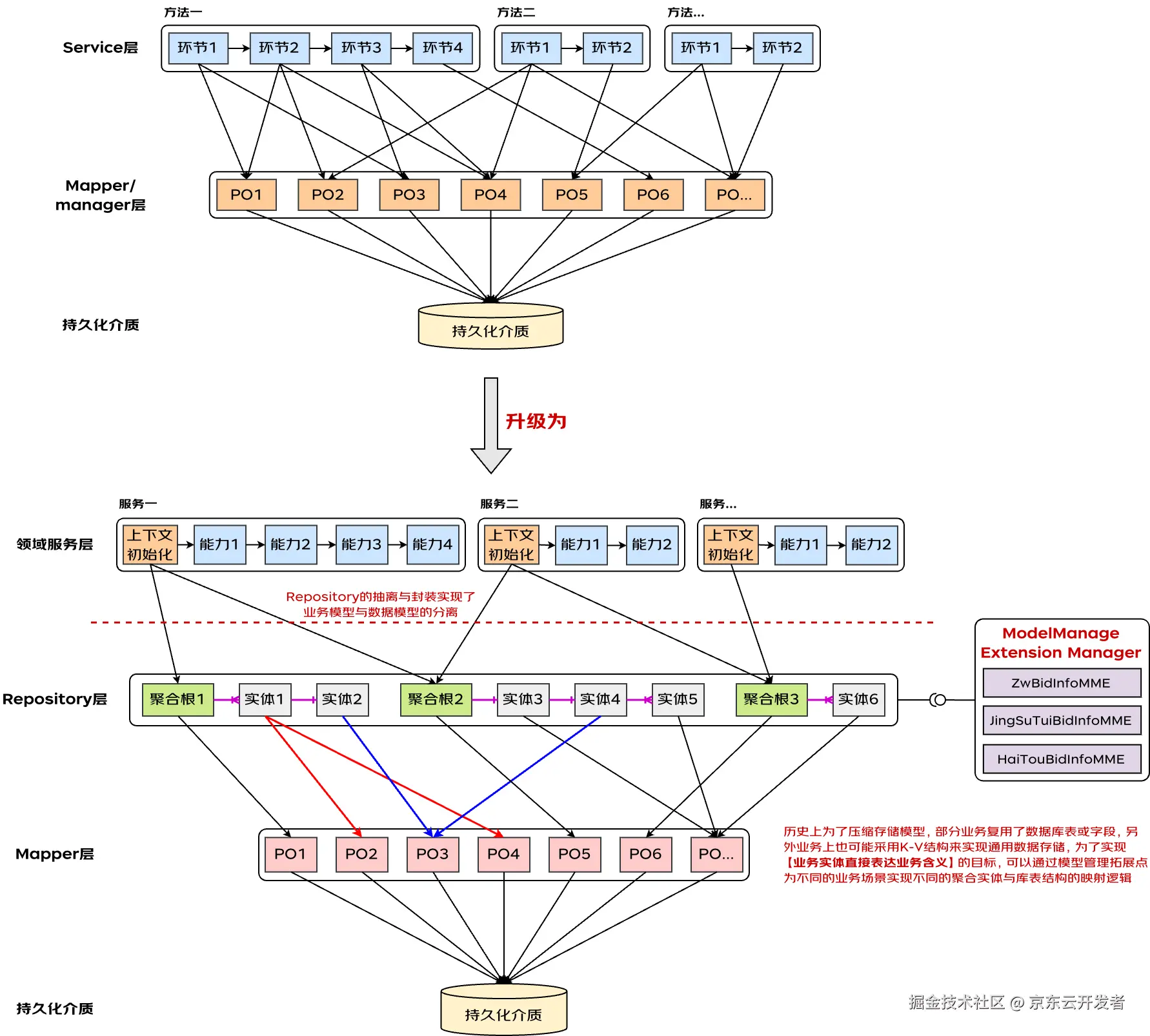 底层通用化存储结构(K-V模式)在资源库中通过模型管理拓展点被映射为领域模型中业务含义明确的实体对象