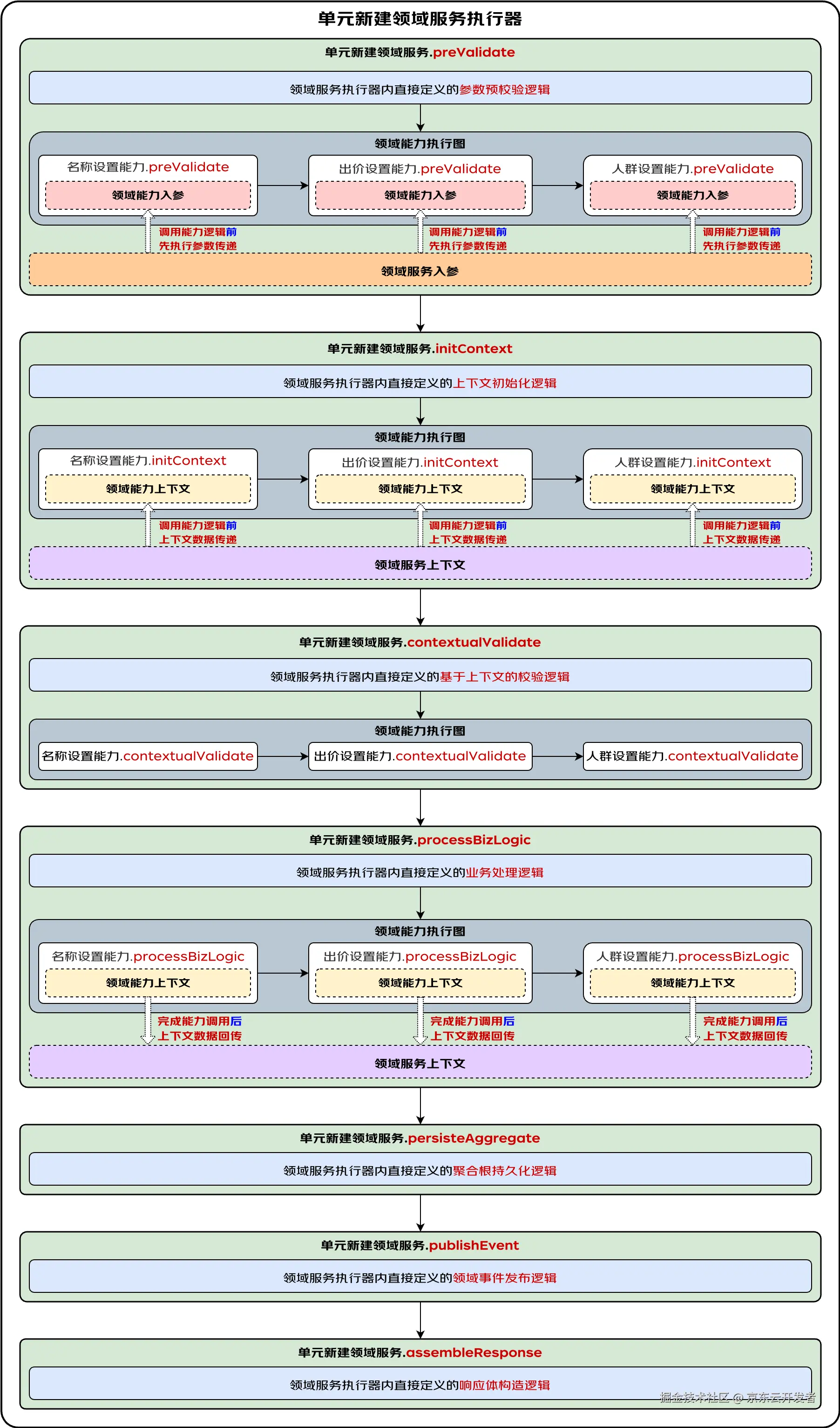 由于标准业务执行器中的剩余的几个标准步骤承载的都是请求维度的逻辑,领域能力执行器标准模版中对这几个方法也做了屏蔽,因此在这几个标准步骤的执行流程中就不需要再调用领域能力执行图了。需要特别说明的是,当执行到聚合根持久化标准步骤时,定义在领域服务及领域能力中的业务规则对实体的变更以及构建出的新业务实体都已经写入到了上下文中,开发者可以充分利用领域服务对数据操作全局把控的职责定位,积极采用批量、异步、并行等手段进行极致地性能优化。