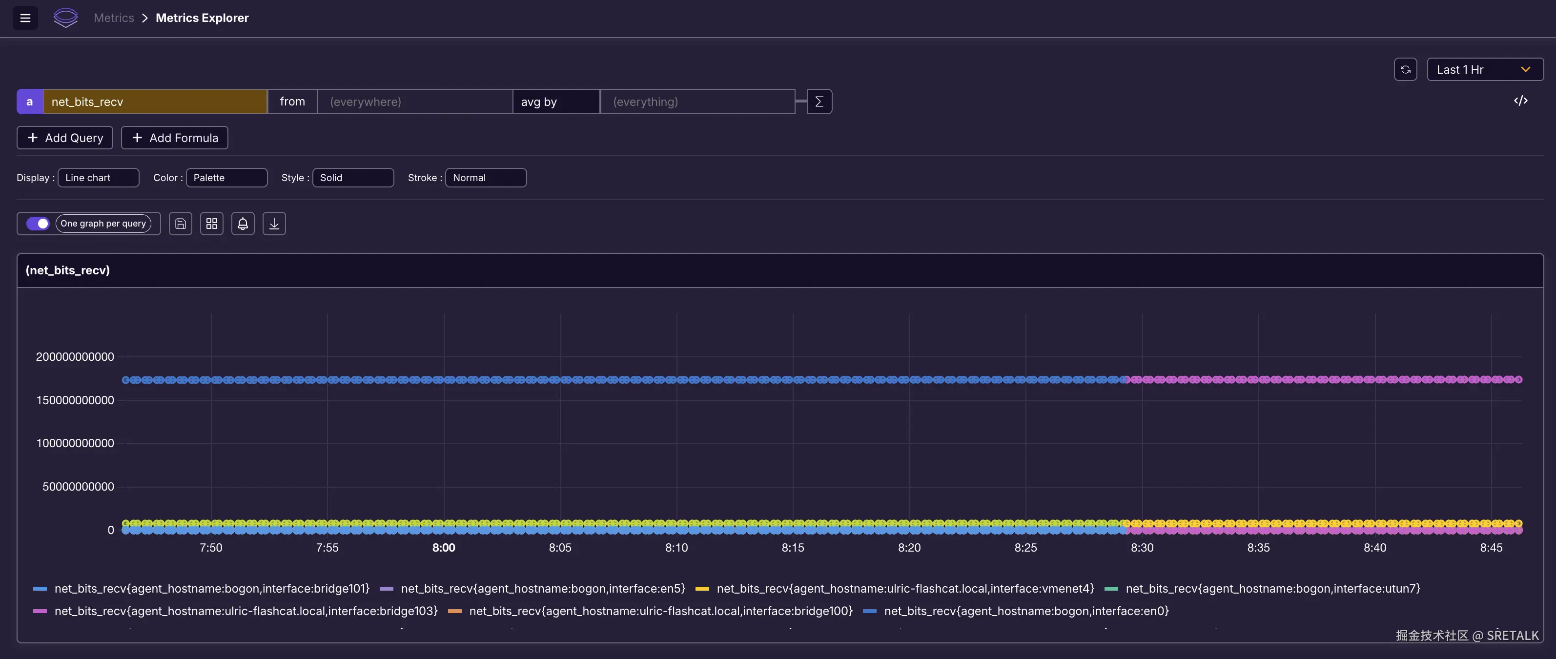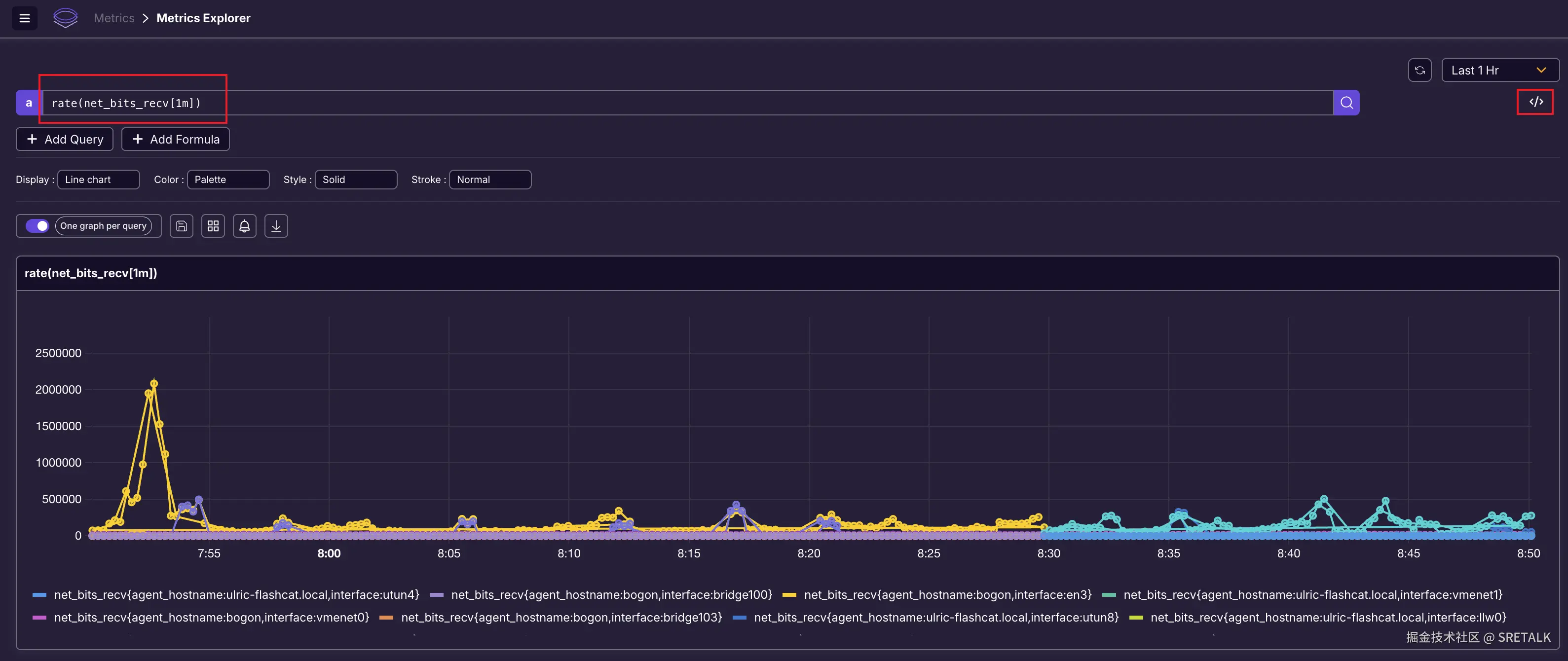 上面查询的是 net_bits_recv 指标,这是一个 Counter 类型的数据,显然大家更关心的是 rate 或 increase 计算之后的结果,于是,我利用它的 UI,增加了 rate 函数:
