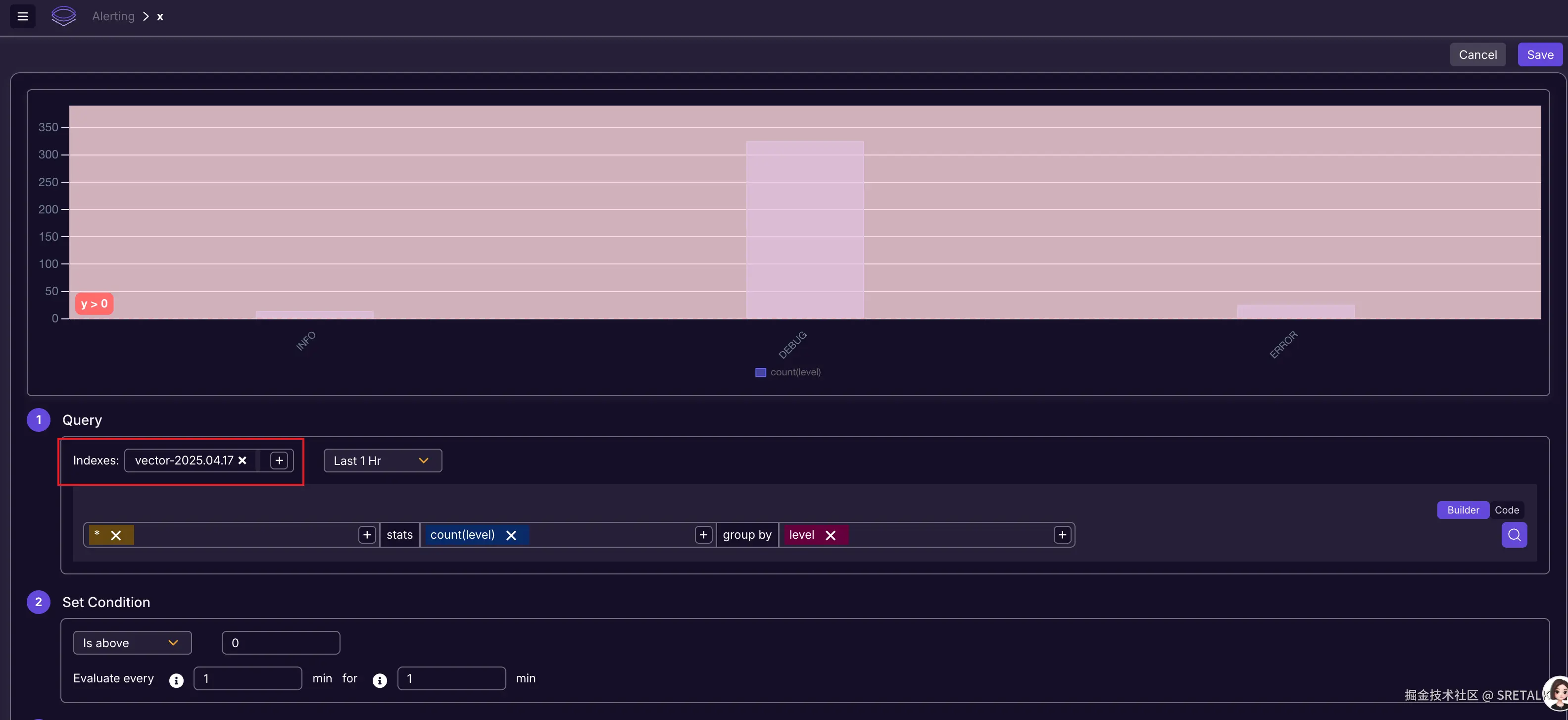 上面的属性中,并没有 index 相关的信息,这就奇怪了,拿到 SigLens 是对所有日志数据都做这个告警判定吗?还是说,SigLens 期望不同的 App 要单独部署一个 SigLens 实例?今天 4.17 号,我重新打开这个告警规则,点击编辑: