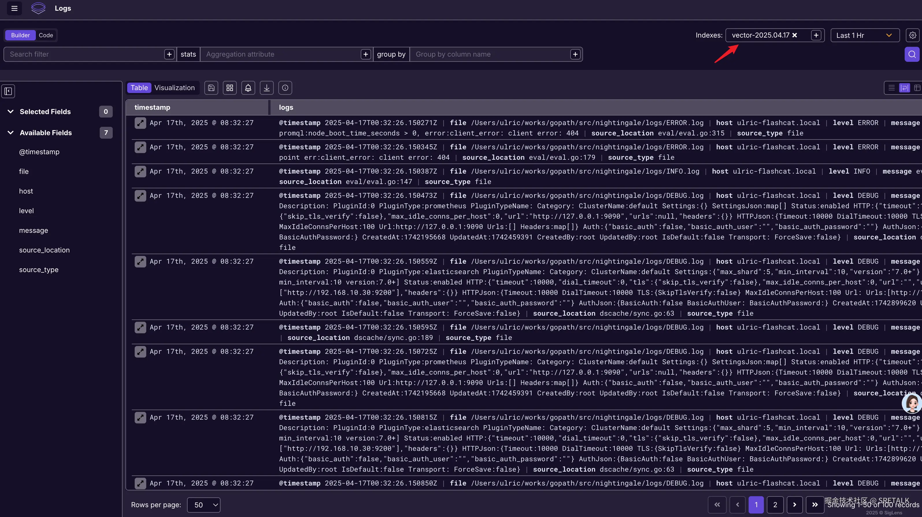 右上角可以看出来,SigLens 也是每天一个索引文件,因为我的采集器是 vector,索引有个 vector 的前缀,不知道是在哪个环节加的。