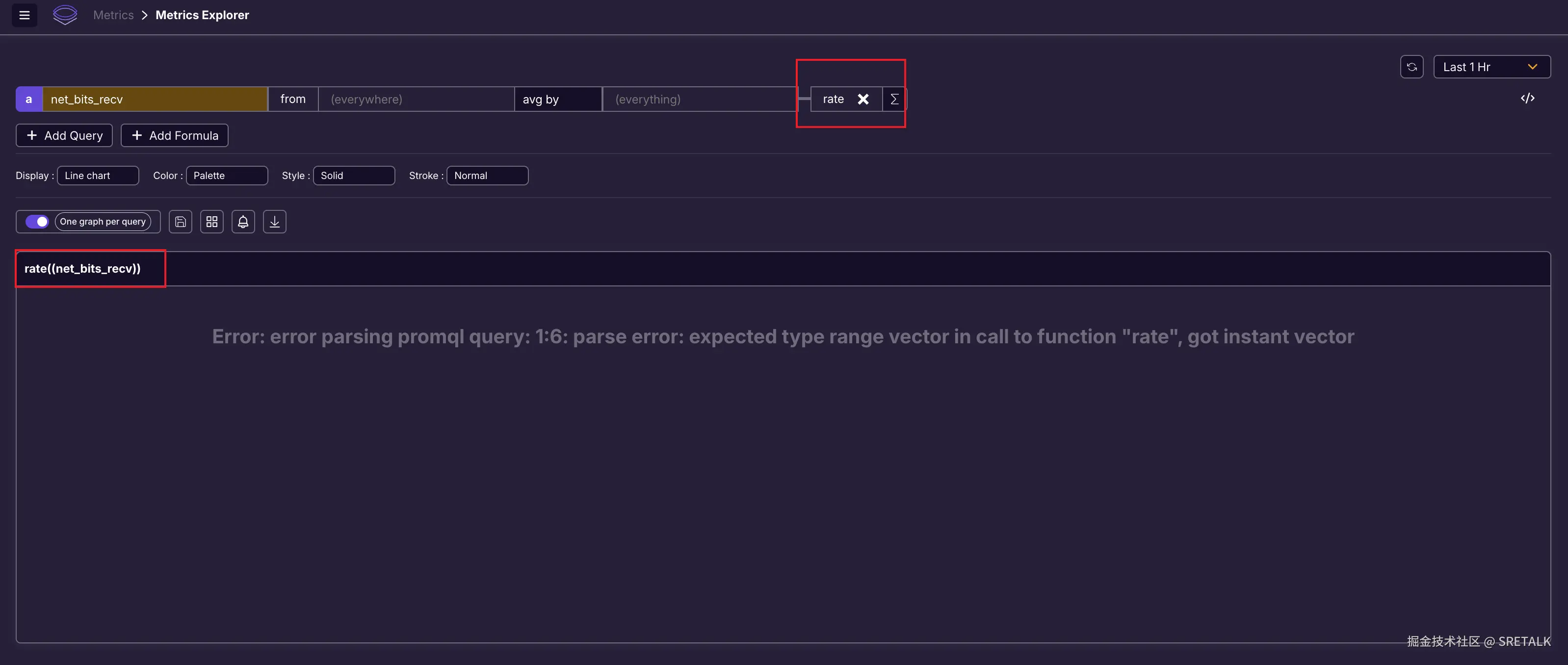 GG 了,竟然没有让我输入 rate 函数的参数,直接就给我执行了,结果是错误的。好在我切到 code 视图,自己手写 Promql 是可以的: