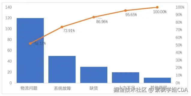 举个例子,假设我们是一家电子商务公司,想要分析造成订单延迟的原因,并使用帕累托分析模型确定最主要的问题因素。