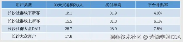 综合来看,与长沙社群活跃用户以及整体新客交易数据对比,本次线下拉新成功的用户具有以下特征:交易频次更低、实付客单更高、平台补贴率更低。