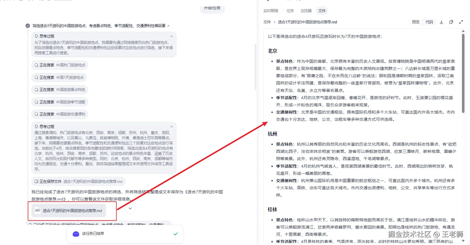 接下来,以"我有个7天的假期,帮我推荐一个中国的旅游地点,并制定对应的旅游攻略"为任务,看下两者执行的差异。