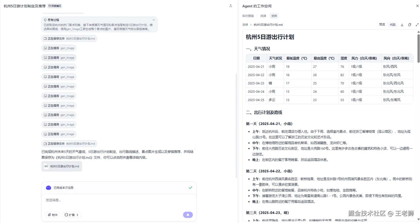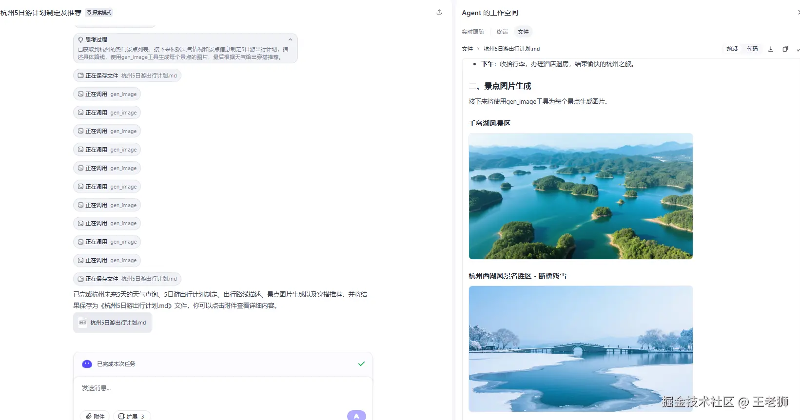 让他完成"查询未来5天的天气,制定一个杭州5日游的出行计划,描述具体的出行路线,并生成每个景点的图片,给出穿搭推荐。"的任务,选择高德,墨迹,和图像生成插件。任务执行如下: