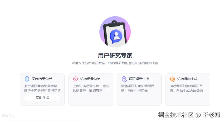 用户研究专家提供了以上4种能力。以调研问卷生成功能为例: