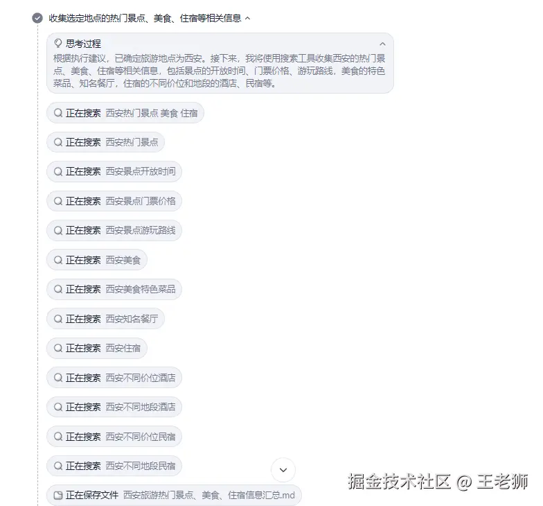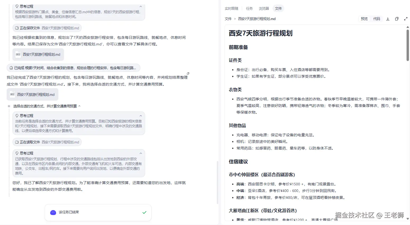 中间过程有些需要用户确认的需要在此交互,比如AI选出推荐的旅游地点之后,用户需要输入对应的地点,然后继续执行后续逻辑。整体来看,规划模式输出的内容更加详细。但运行时间也更长,预计10分钟左右。