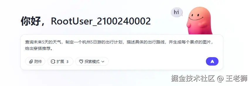 - 你输入“帮我制定一份杭州的旅行攻略”,Agent会自动分解任务:查天气→找景点→规划路线→生成图文手册→甚至预订机票。