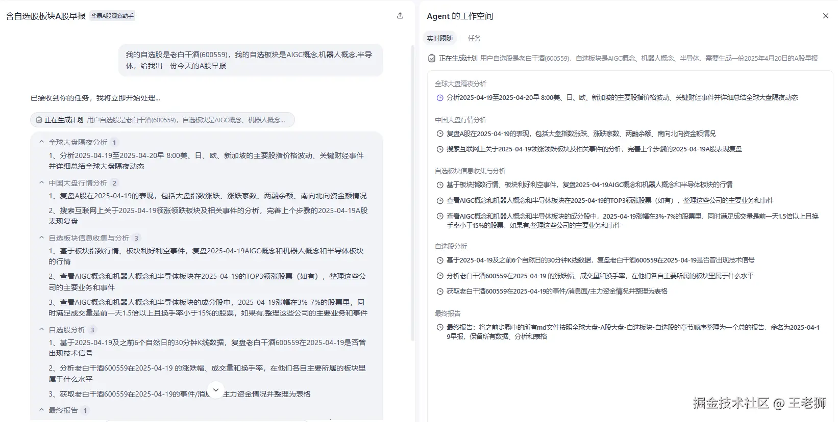 根据用户的需求,以及所需要的数据,指定任务的规划。然后执行规划生产对应的早报内容。因为规划内容比较多,整体执行耗时很长。大概20多分钟。