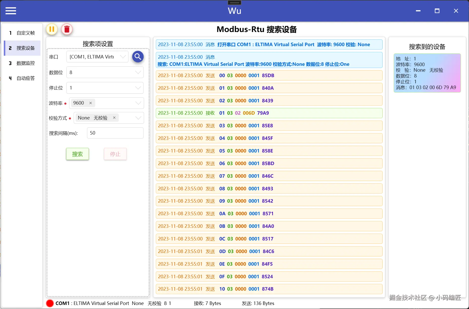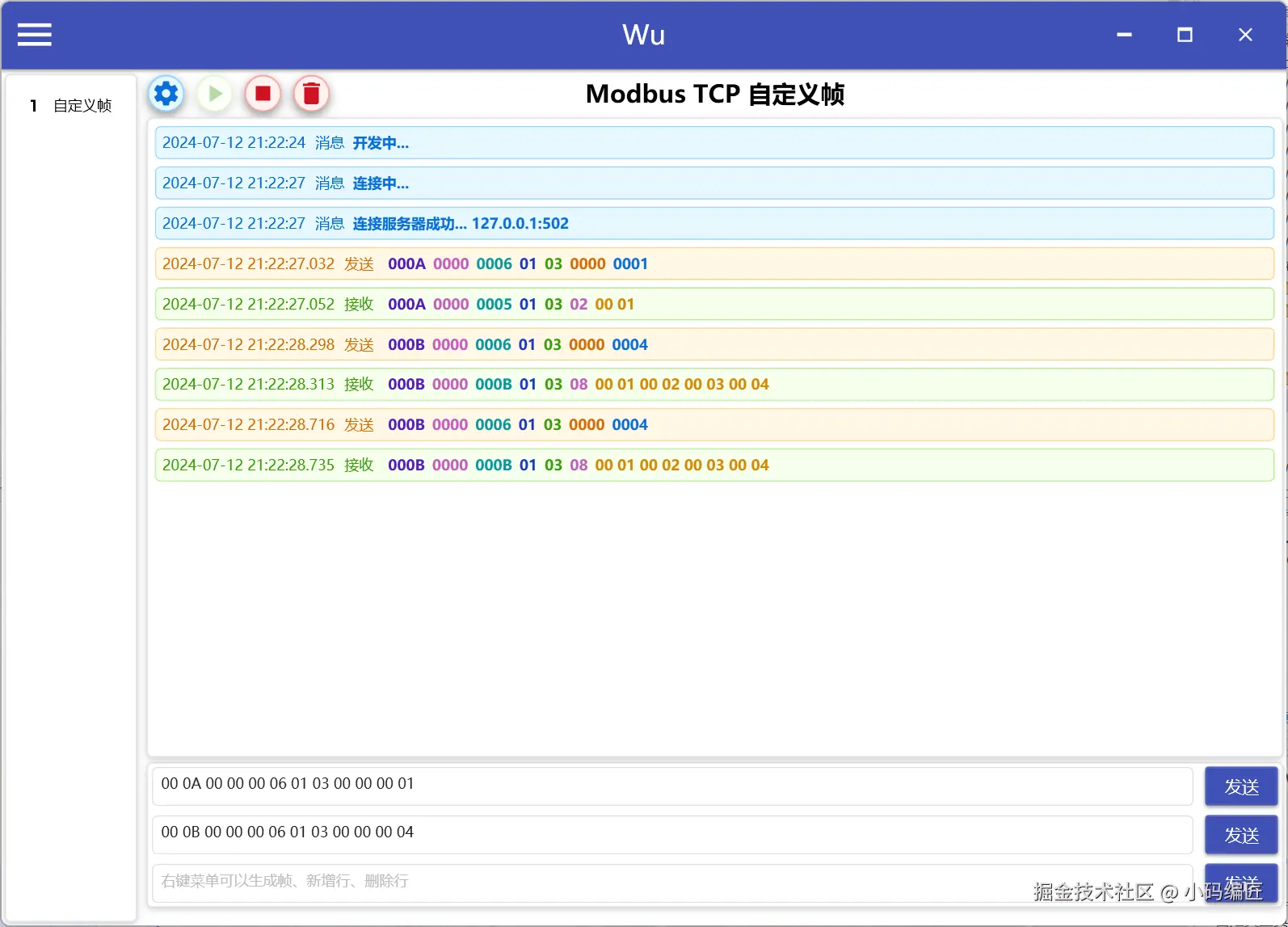 Wu通讯调试工具具备多种特色:支持Modbus RTU及MQTT服务器和客户端调试;采用丰富的界面色彩设计;能够自动解析Modbus RTU数据帧;内置智能防粘包机制,确保在高速传输下帧解析的准确性,对于无法校验的帧会进行错误提示。