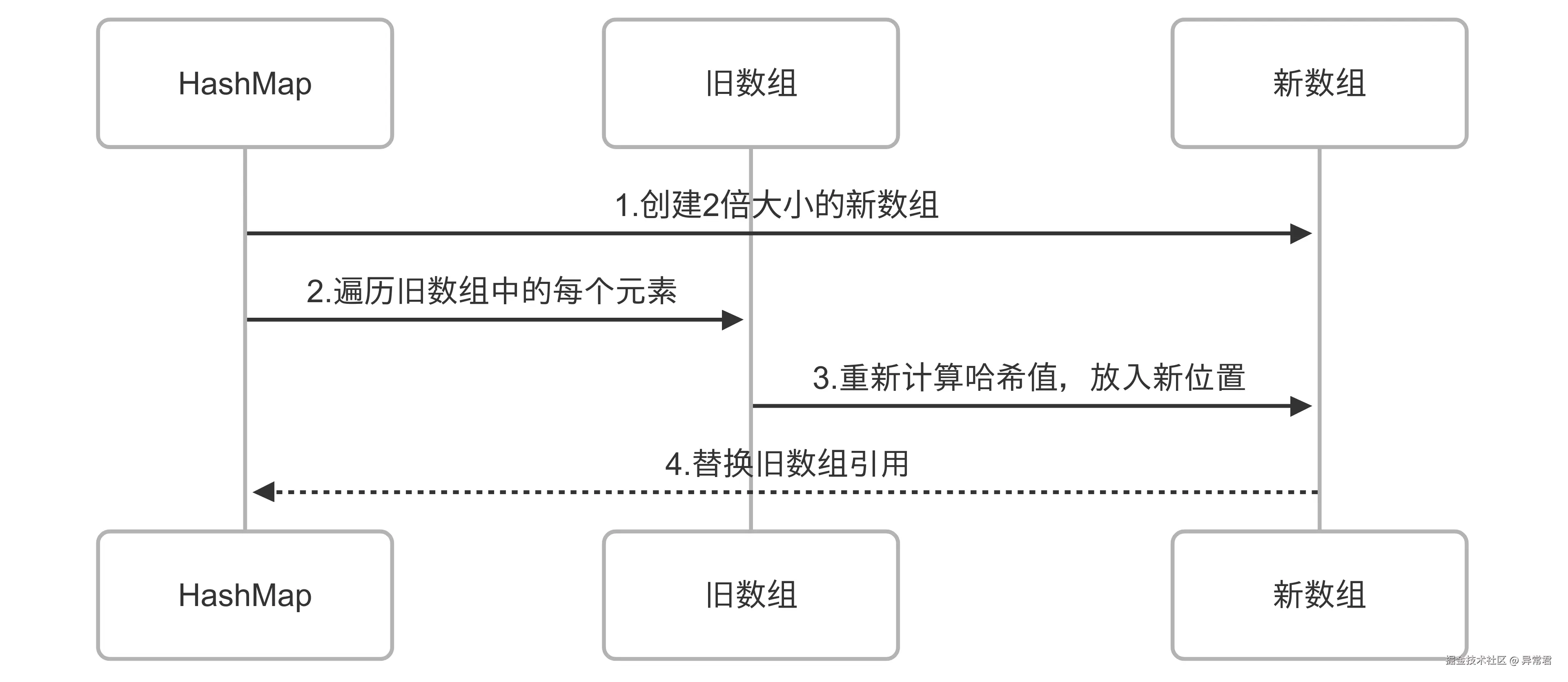 一个 1G 的 HashMap 扩容后需要创建一个 2G 的新数组。在扩容过程中,新旧数组同时存在于内存中,这意味着暂时需要 3G 的内存空间!